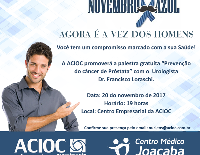 Para participar e conhecer mais detalhes e fortalecer a prevenção ao Câncer de Próstata, participe desta Palestra Gratuita que acontecerá no dia 20 de novembro a partir das 19h30 no Centro Empresarial da ACIOC, área central de Joaçaba. A presença pode ser confirmada pelo e-mail núcleos@acioc.com.br. Informações pelo telefone (49) 35211333.