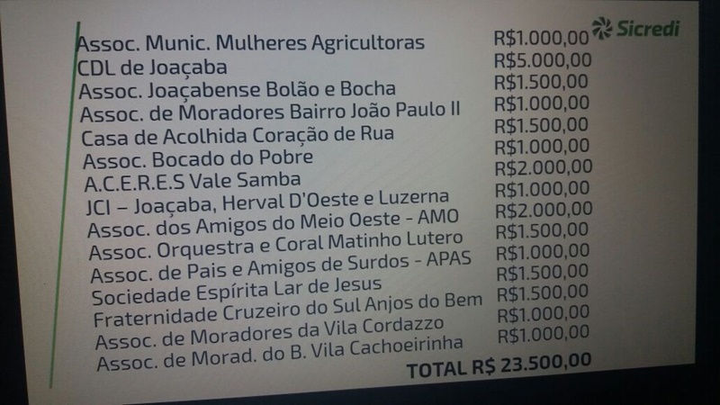 SICREDI repassa mais de R$ 23 mil para 16 entidades de Joaçaba