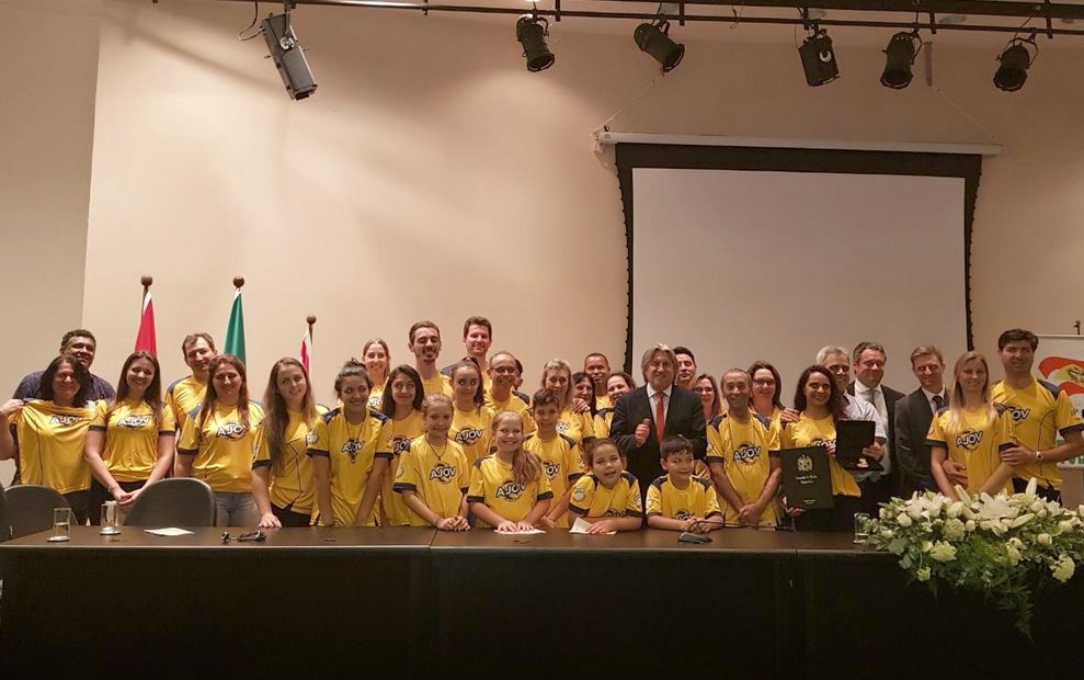 A AJOV foi homenageada pelos mais de 20 anos de relevantes serviços prestados ao desporto catarinense, com o título de personalidade jurídica junto com outras personalidades estaduais. De acordo com Roberto Wesoloski – Betinho, que é um dos fundadores da entidade e hoje integra o Conselho Estadual de Esporte, a honraria enaltece as ações desenvolvidas pela entidade desde o projeto social com as bases até o rendimento. “A homenagem é um símbolo do nosso reconhecimento às iniciativas que vem contribuindo para a formação não só de atletas mas, de cidadãos. Também destacadas nossos esforços ao planejamento, desempenho das equipes de rendimento e a excelência com os trabalhos sociais com a integração de aproximadamente 300 alunos em cinco núcleos”, pontua. “O Conselho levou em consideração ainda nossas ações de gestão durante estes mais de 20 anos de serviços a comunidade e ainda, por ser a entidade que revelou uma atleta campeã olímpica, Natalia Zílio Pereira – atual capita da Seleção Brasileira de Vôlei, formada pela AJOV”, salienta.