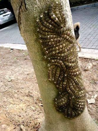 A vegetação e o clima quente colaboram para que os insetos se proliferem facilmente junto à natureza. As lagartas costumam ser encontradas em grupos e em troncos de árvores.