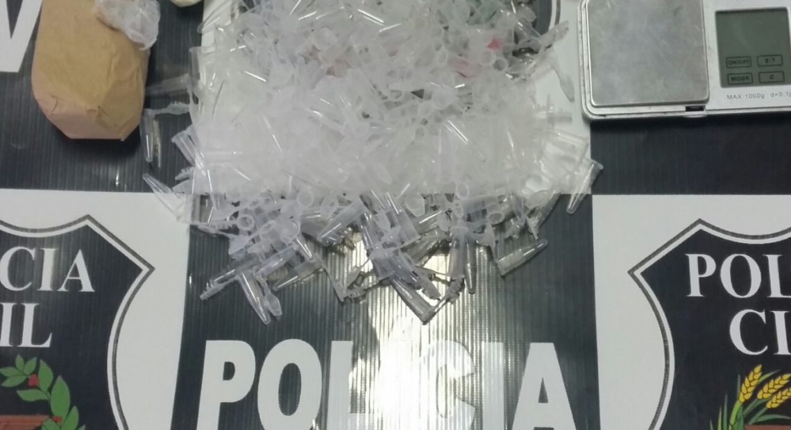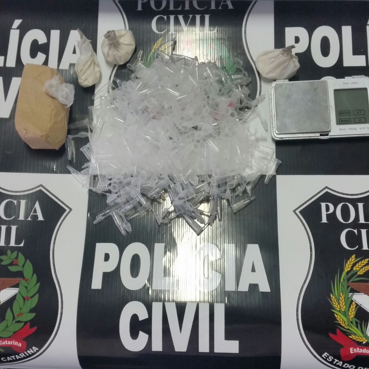 A Polícia Civil de Joaçaba, dando continuidade as investigações de tráfico de drogas na cidade Joaçaba, no final da noite de ontem, abordou um veículo na cidade de Erval Velho, que se deslocava do litoral para a cidade de Joaçaba. O veículo não respeitou as ordens de parada emanadas pelos policiais, por essa razão foram efetuados disparos nos pneus e no tanque de combustível. No local os policiais apreenderam 287 pinos vazios utilizados para a venda de cocaína. O veículo foi encaminhado para a Delegacia, onde após busca minuciosa foi encontrada escondida debaixo do volante 110 gramas de cocaína, ainda em forma bruta.