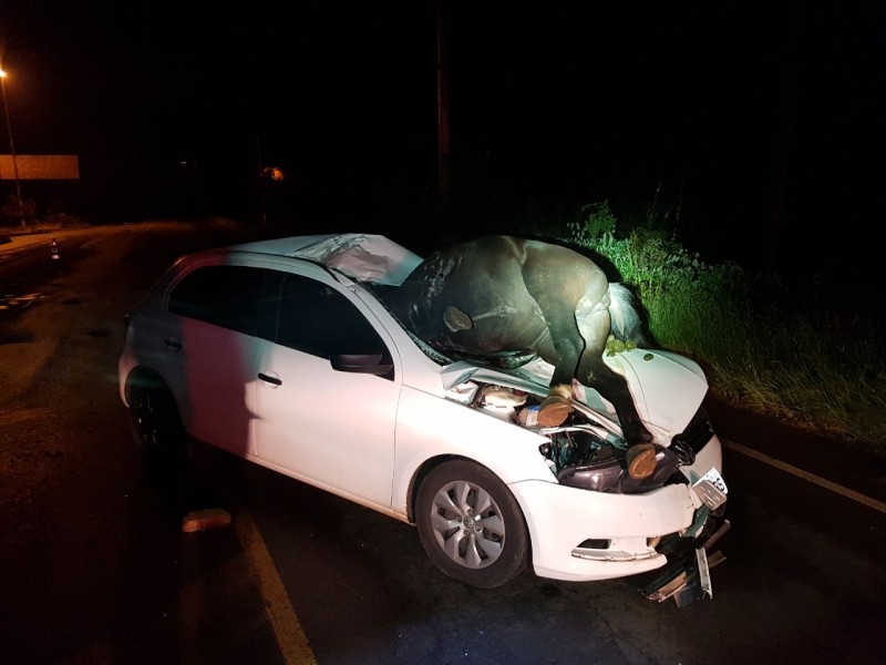 Videira – O condutor de um Gol foi surpreendido por uma égua na pista quando trafegava pela SC-135 na madrugada desta quarta-feira (28) nas proximidades do acesso à Linha Gramados, limite entre os municípios de Rio das Antas e Videira. Sem ter como desviar, o motorista acabou atropelando o animal, que atravessou o para-brisa do carro e morreu.