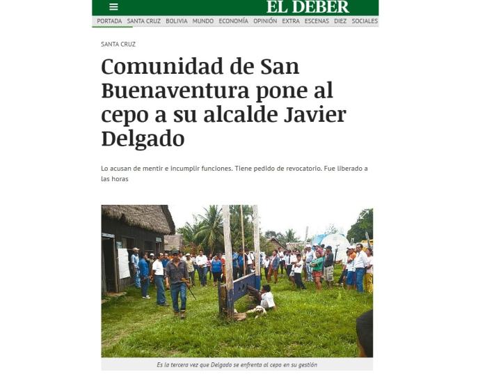 O prefeito de San Buenaventura, nas proximidades de La Paz, na Bolívia, permaneceu uma hora preso em uma armadilha de madeira no último fim de semana. A ação dos moradores foi uma punição contra Javier Delgado pelo que consideram má administração. As informações são do jornal boliviano El Deber. O prefeito disse que o caso se trata de “uma confusão total” e que a punição teria sido motivada por pessoas que procuram revogar seu mandato.