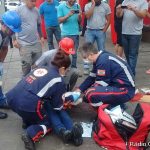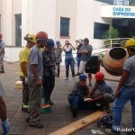 Desta vez a mobilização aconteceu por parte dos integrantes da construção civil, que realizaram na praça Adolfo Konder uma simulação de acidente de trabalho, que contou com a colaboração de funcionários das empresas participantes, além da Polícia Militar (PM) e também do Samu, que disponibilizou duas ambulâncias para deixar a cena ainda mais real.