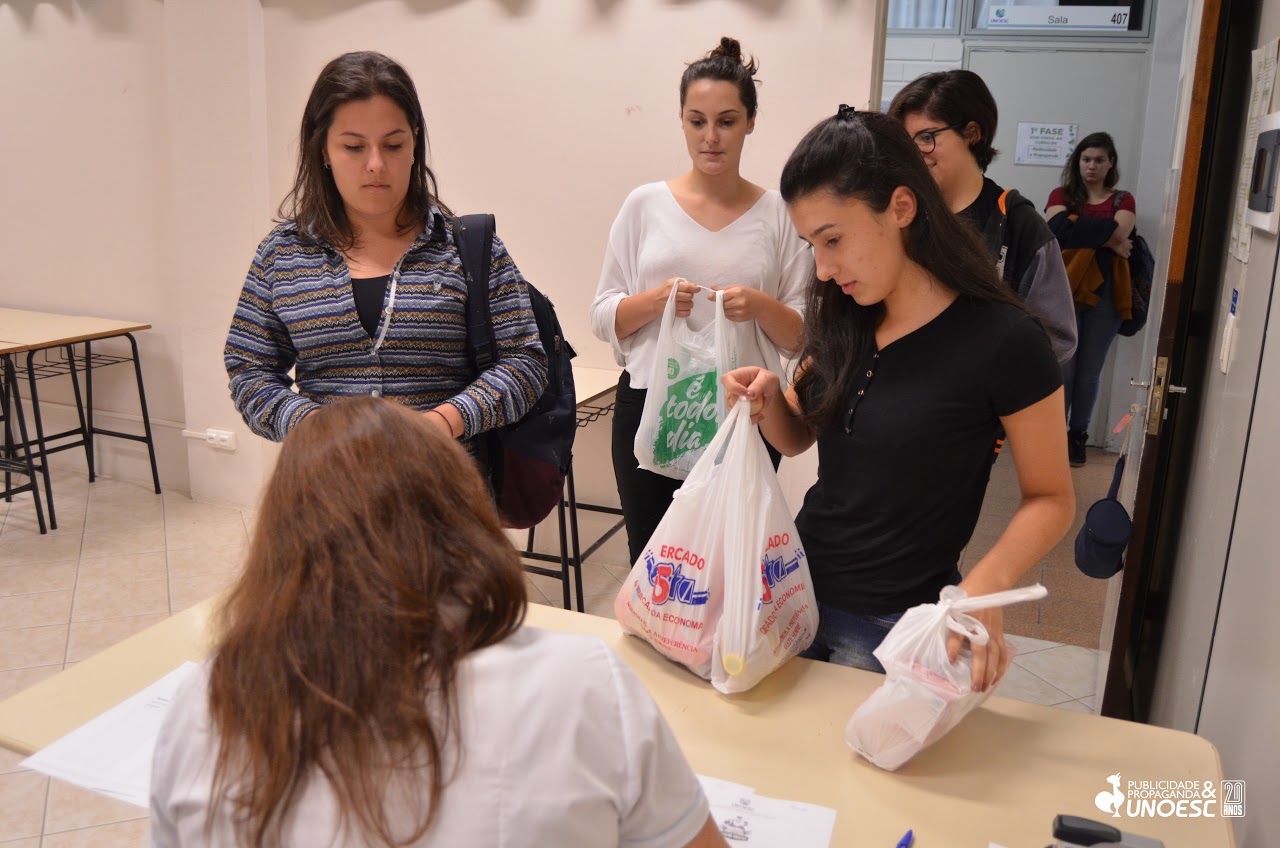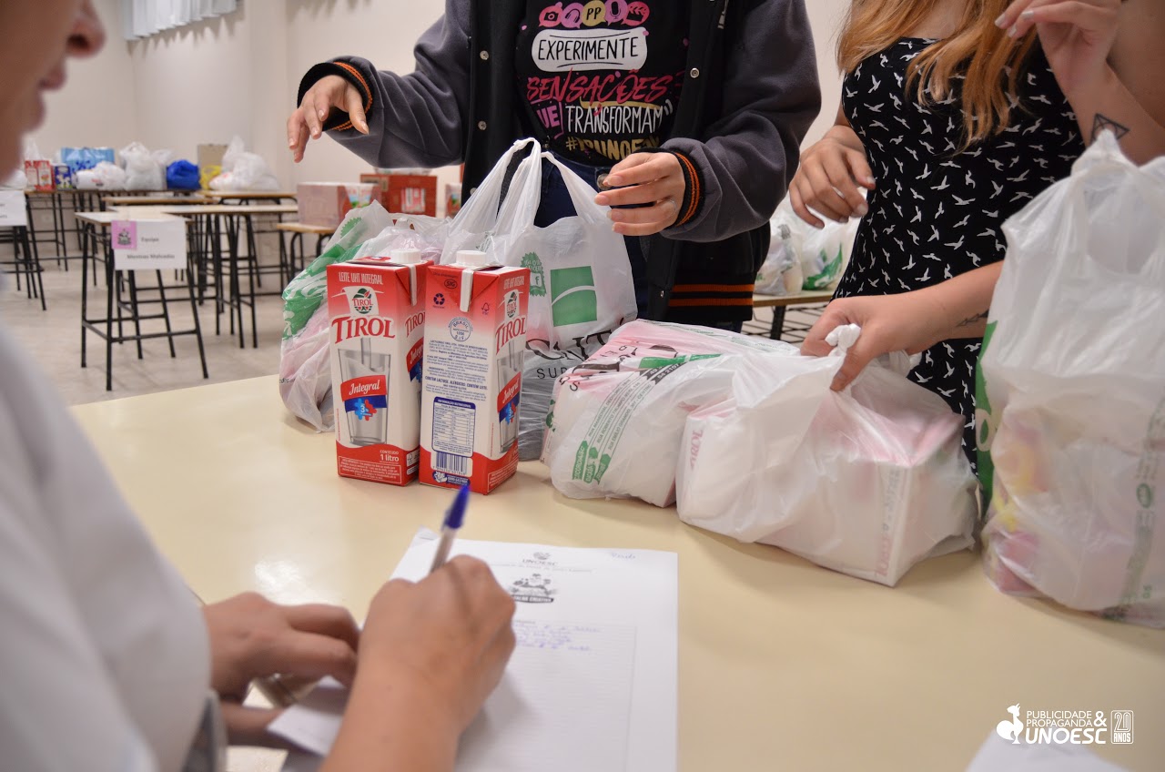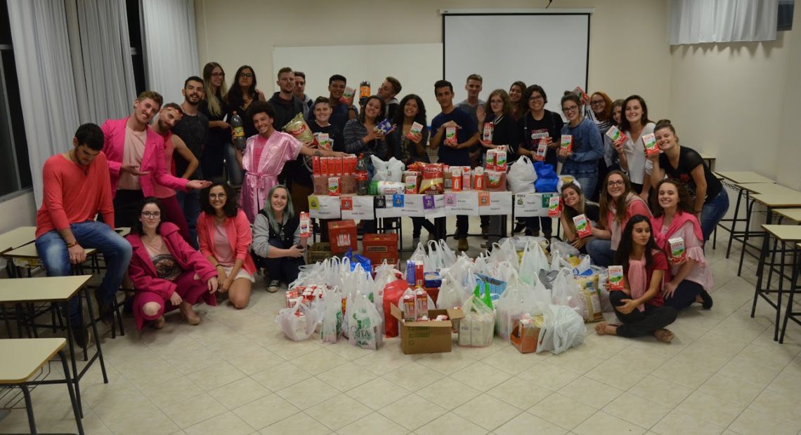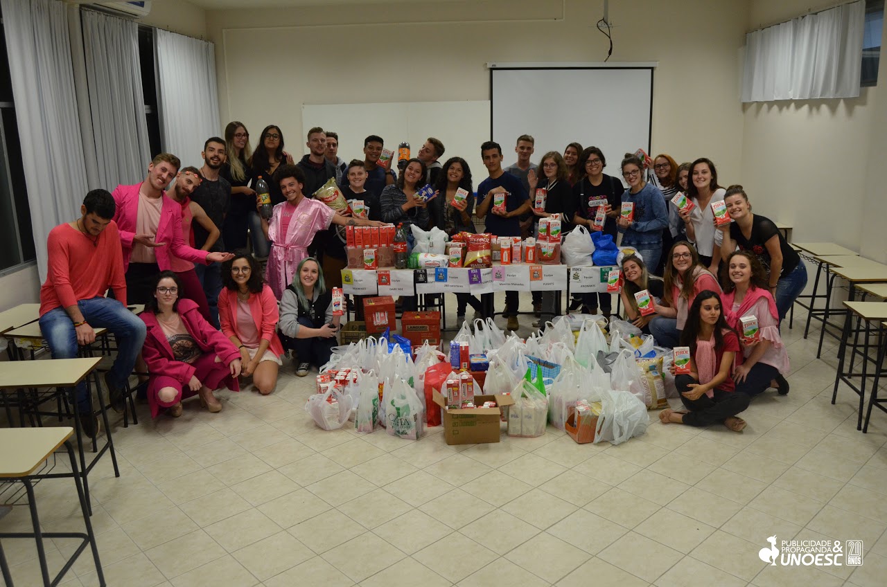 O curso de Publicidade e Propaganda da Unoesc Joaçaba realizou uma doação de 169 kg de alimentos e 339 litros de leite ao Centro de Referência de Assistência Social (CRAS) de Joaçaba, na tarde de quinta-feira (5). O montante foi arrecadado em uma prova que já conta pontos para o 6º Acampar – Batalha Criativa, que é a principal atividade do curso e neste ano acontece de 13 a 14 de abril, no interior da cidade de Joaçaba. Todos os alunos do curso participam. – Nesta semana, antes do evento, já acontecem algumas provas, entre elas, a arrecadação de alimentos e leite, que neste ano foram doados para o CRAS de Joaçaba porque a gente entende que esta atividade também tem um cunho social e a gente tem que fazer a nossa parte – explica o coordenador do curso, Paulo Santos.