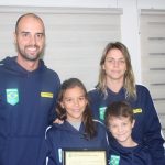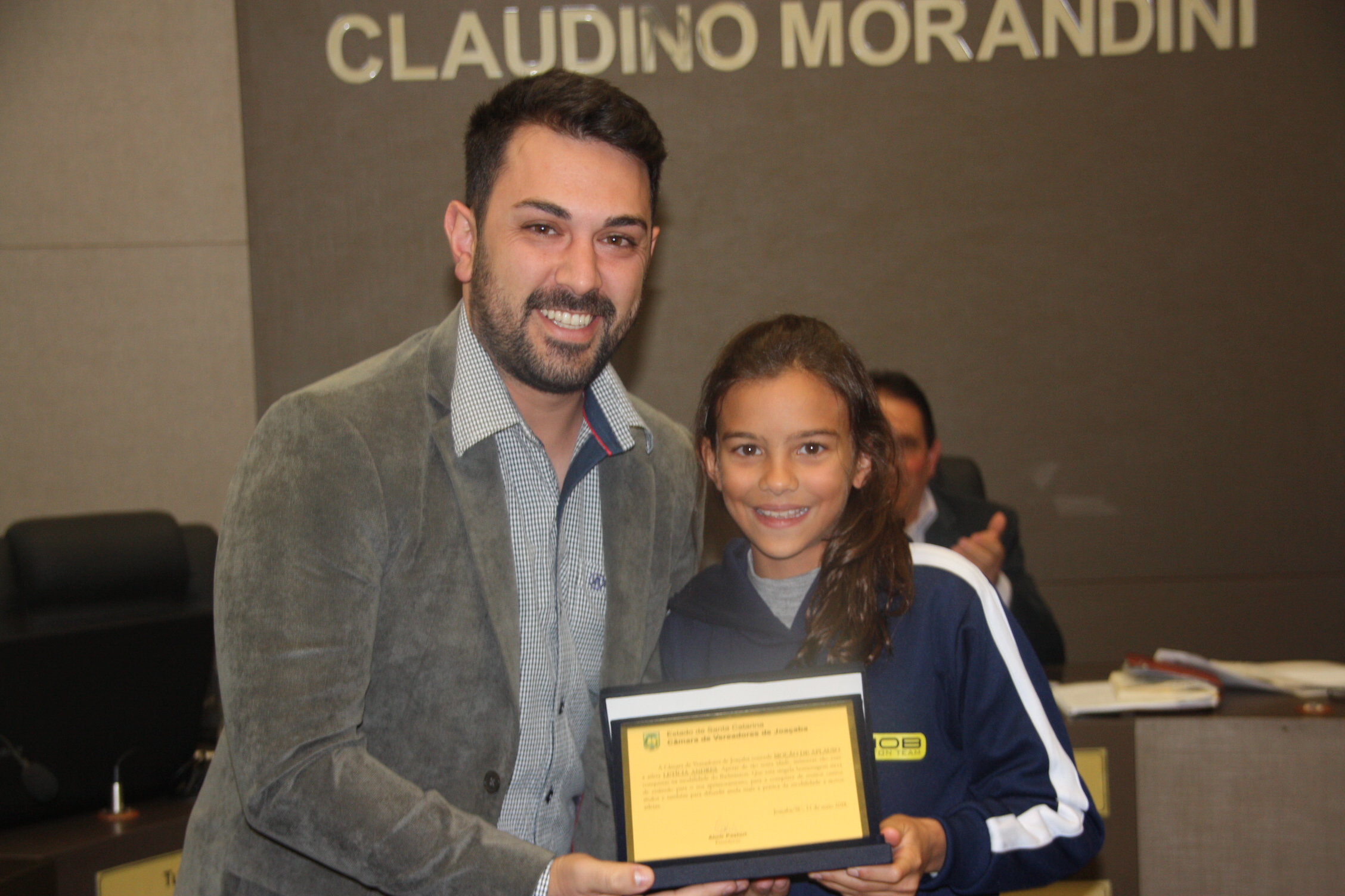 “Seu exemplo, sua persistência e suas conquistas nos motivaram a fazer esta homenagem pela Câmara de Vereadores de Joaçaba, disse o vereador Diego Bairros ao fazer a entrega de uma Moção de Aplauso para a atleta em sessão desta segunda-feira (21). Diego foi o proponente da homenagem que recebeu apoio de todos os demais vereadores. “Nós, enquanto agentes públicos temos o compromisso de proporcionar e facilitar o acesso das crianças ao esporte. Trata-se de uma oportunidade que pode mudar, para melhor, a vida de uma criança”, disse o vereador. Familiares e atletas prestigiaram o ato.