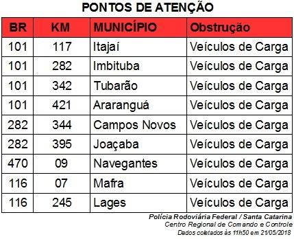 A Polícia Rodoviária Federal divulgou no final da manhã desta segunda-feira, dia 21, os locais onde os caminhoneiros estão mobilizados em Santa Catarina.33072857_1909866089064689_6225492041137127424_n