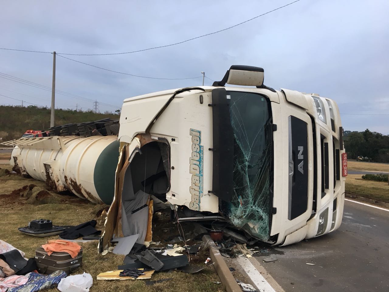 O condutor de iniciais V.R de 56 anos, que reside em Xaxim, relatou que um automóvel cortou sua frente e para evitar a colisão acabou tombando a carreta. Ele sofreu um corte no rosto e recusou atendimento dos bombeiros, assinou um termo e permaneceu no local. A carreta tanque que fazia o sentido Joaçaba/Catanduvas, transportava Arla (Agente redutor líquido de óxido de nitrogênio automotivo).