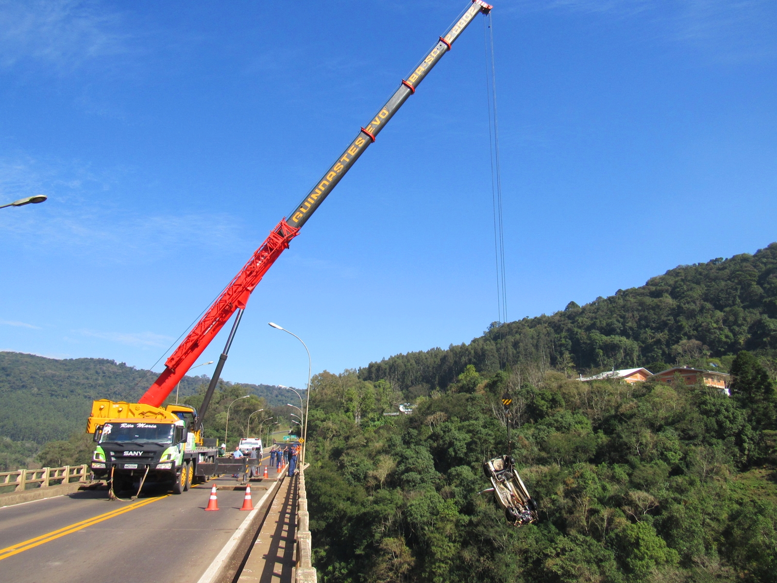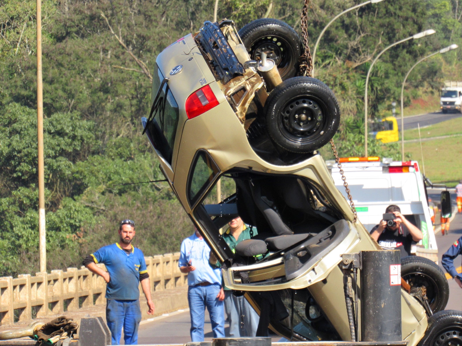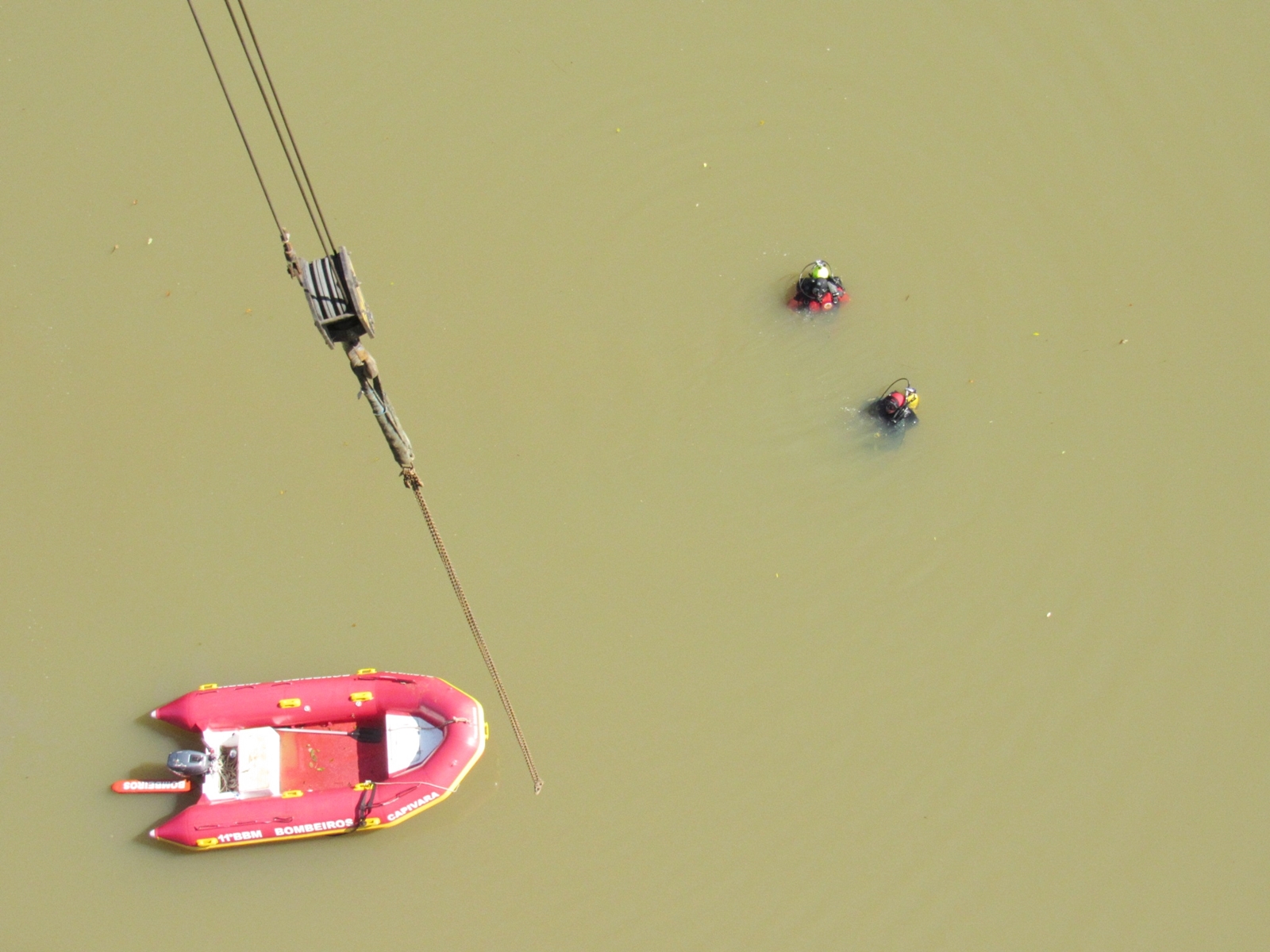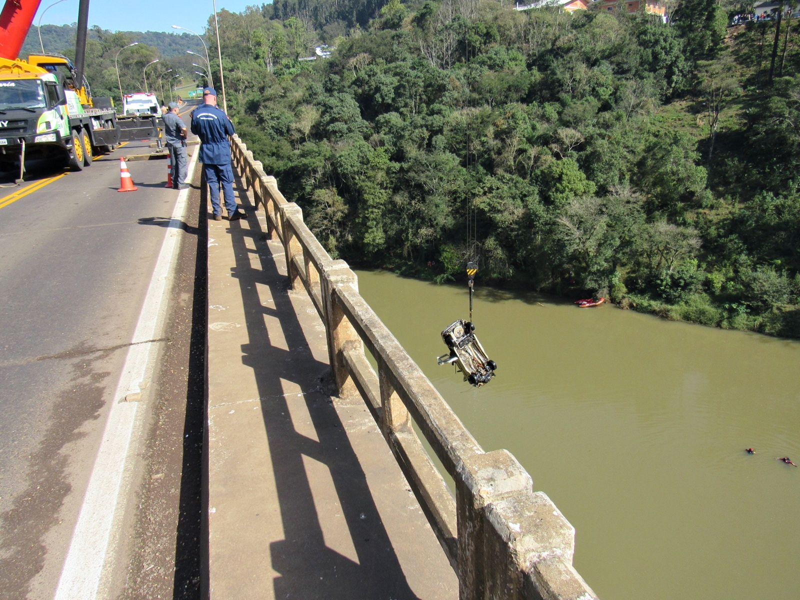 O veículo VW/Gol com placas de Erval Velho que caiu na noite desta quarta-feira (04) da ponte Alfredo Ítalo Remor na BR-282 em Joaçaba foi içado das águas do Rio do Peixe no final da manhã desta quinta-feira (05). A operação exigiu um guindaste de grande porte e também a interdição do trânsito na ponte por cerca de duas horas. Dois mergulhadores do Corpo de Bombeiros prenderam cabos no veículo que estava numa profundidade de 10 metros para que o guindaste pudesse executar o serviço. O trabalho foi rápido e sem nenhum imprevisto.