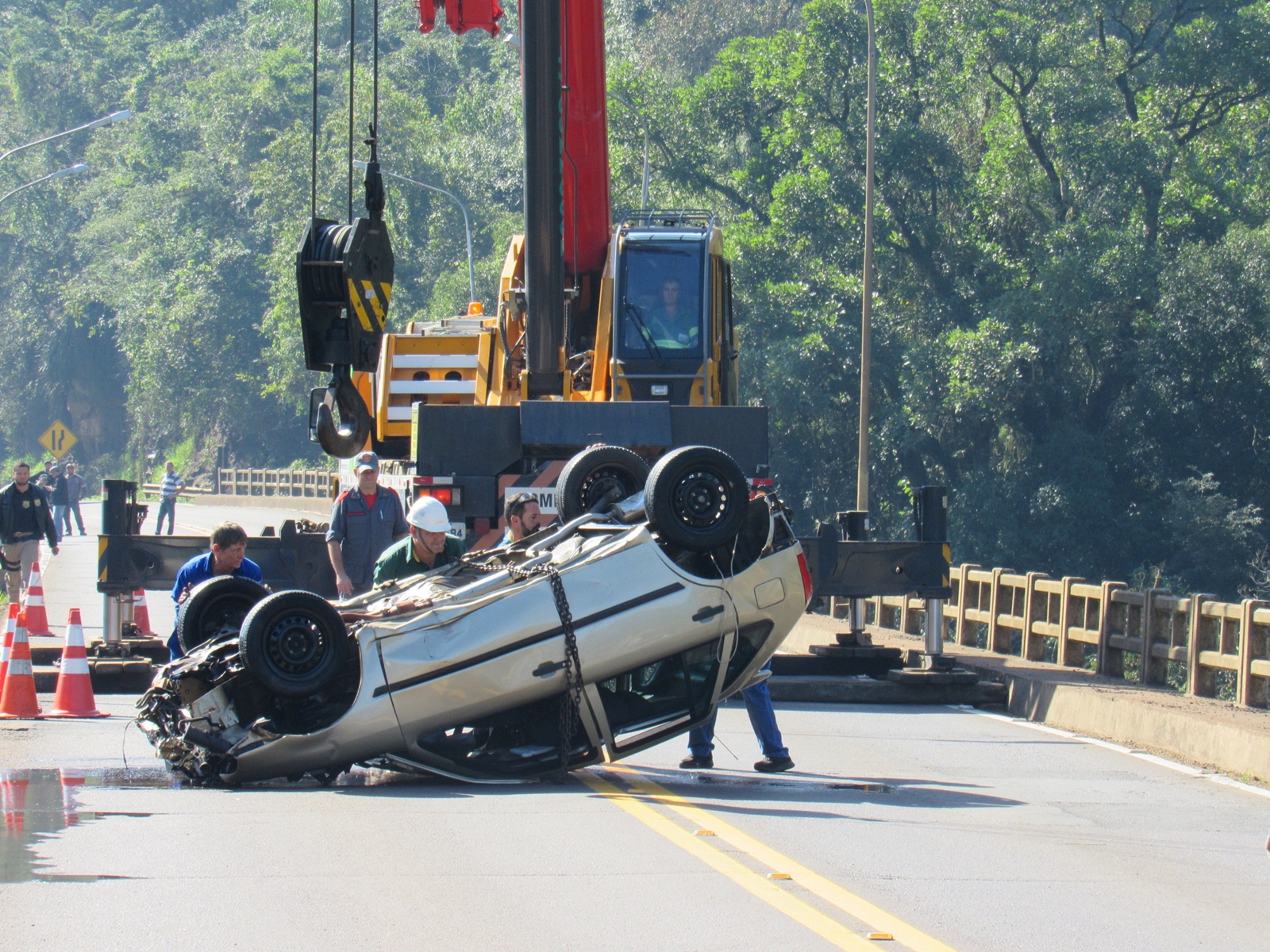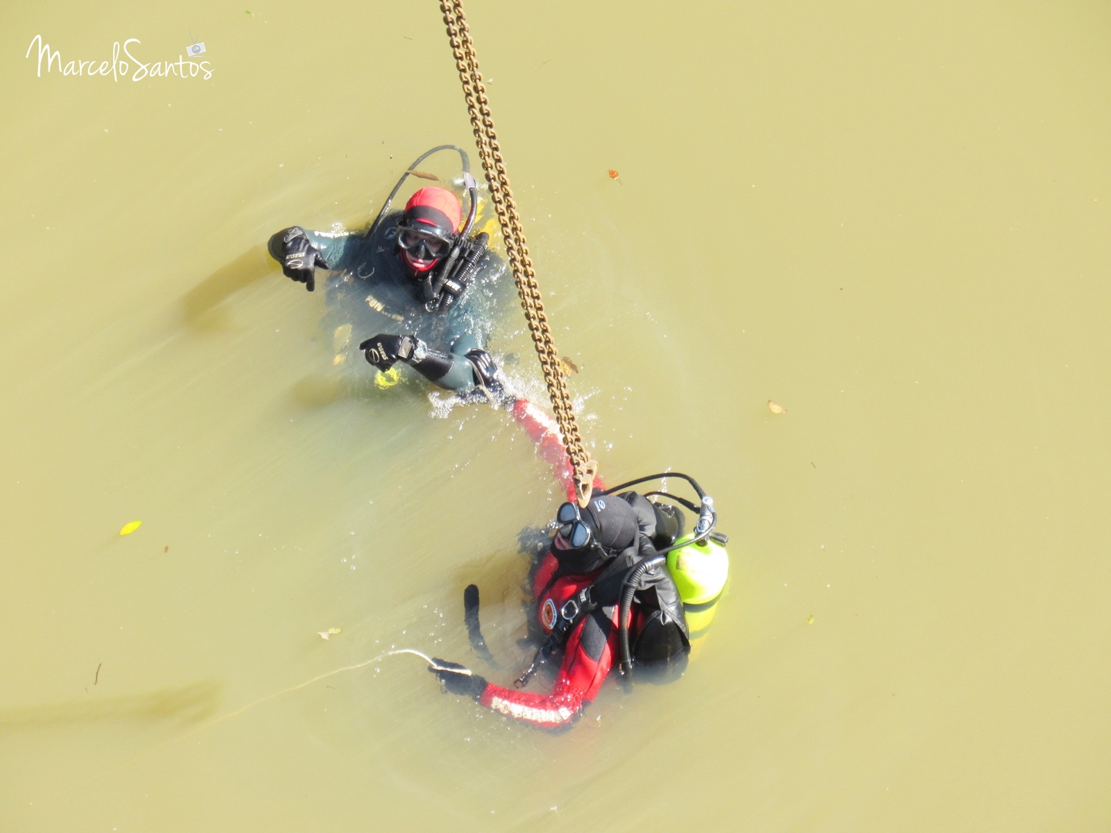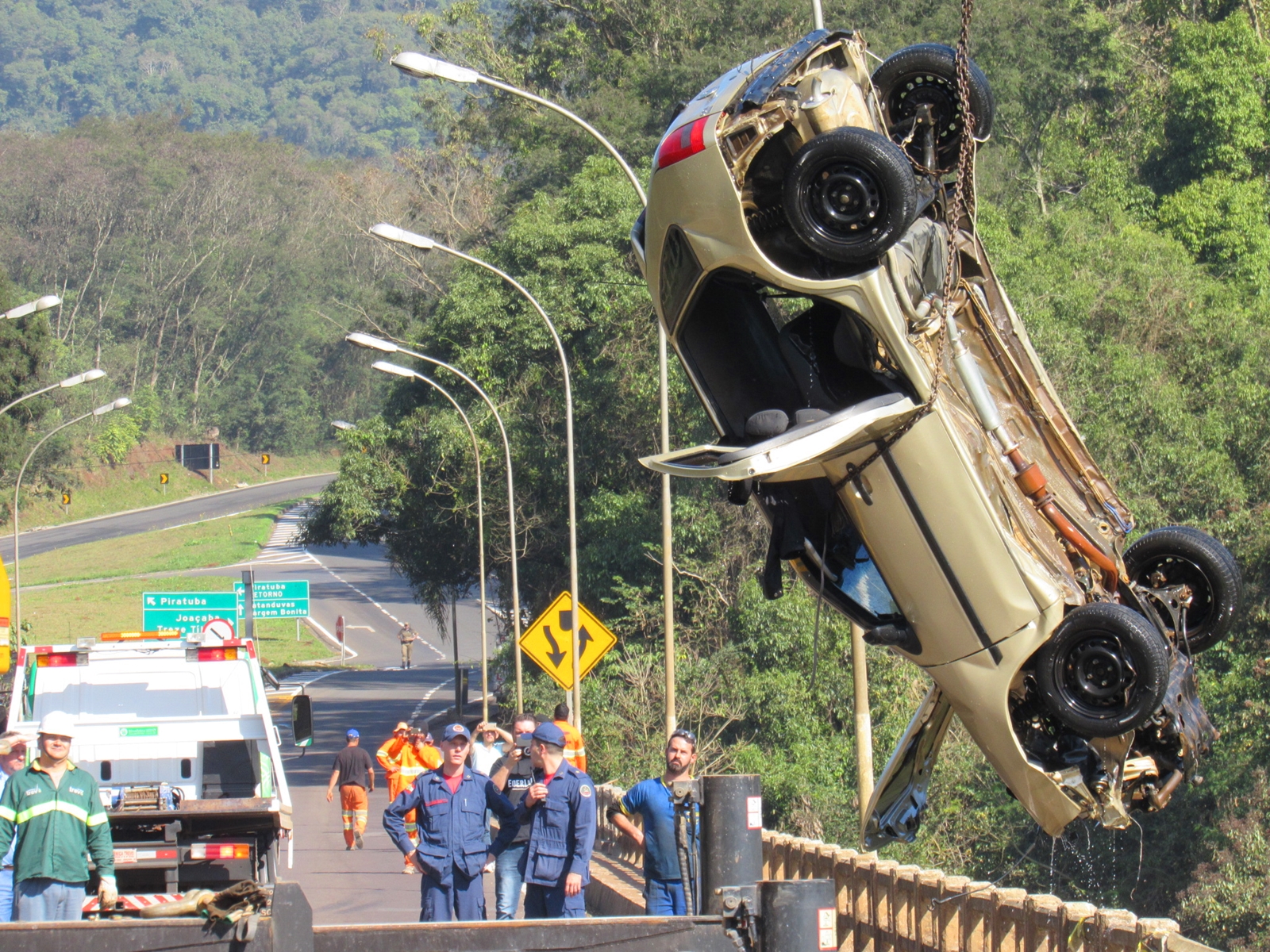 O veículo VW/Gol com placas de Erval Velho que caiu na noite desta quarta-feira (04) da ponte Alfredo Ítalo Remor na BR-282 em Joaçaba foi içado das águas do Rio do Peixe no final da manhã desta quinta-feira (05). A operação exigiu um guindaste de grande porte e também a interdição do trânsito na ponte por cerca de duas horas. Dois mergulhadores do Corpo de Bombeiros prenderam cabos no veículo que estava numa profundidade de 10 metros para que o guindaste pudesse executar o serviço. O trabalho foi rápido e sem nenhum imprevisto.