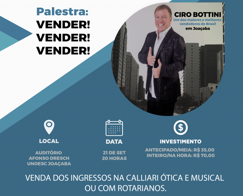 Vender é uma atividade que realizamos diariamente, independente de trabalharmos no comércio ou na indústria. Vendemos ideias, atitudes, valores e muito mais. Partindo por este viés, o Rotary Club Joaçaba traz para Joaçaba, no dia 21 de setembro de 2018, a palestra Nacional com Ciro Bottini, que acontecerá às 20 horas no Auditório Afonso Dresch na Unoesc. “Vender, Vender, Vender”, este é o título que será abordado por um dos maiores vendedores do país, que consagrou sua carreira no Canal Shoptime.