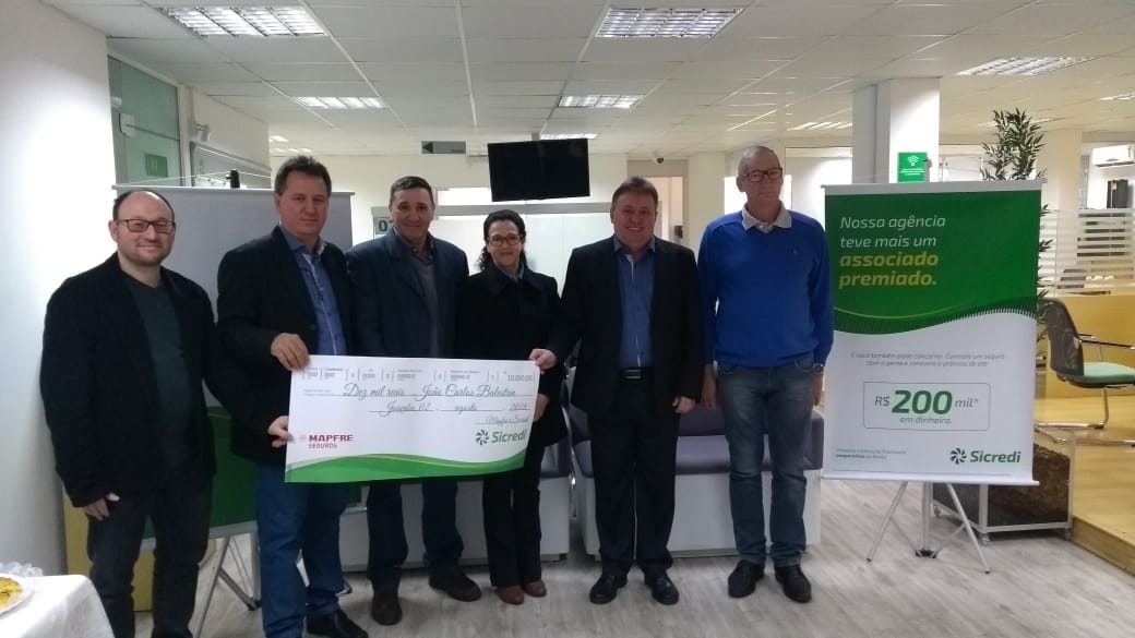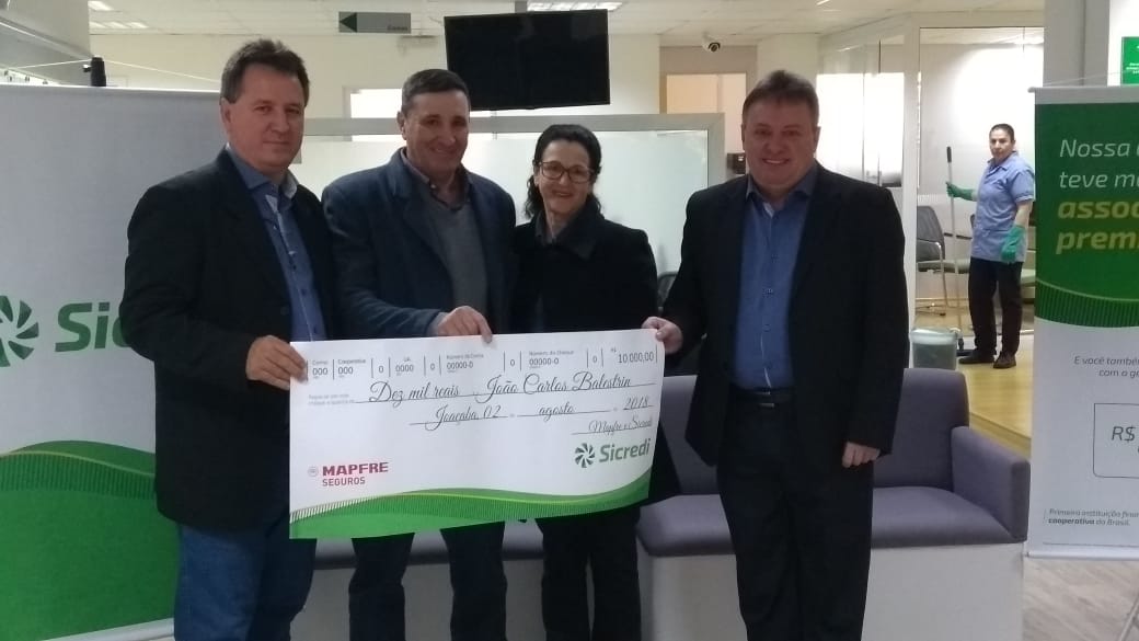O SICREDI fez na manhã desta quinta-feira (02) em Joaçaba a entrega de prêmio do Seguro Residencial a mais um contemplado. O cliente João Carlos Balestrin, associado desde 2014, foi o felizardo e recebeu um prêmio em dinheiro de R$ 10 mil.    Os sorteios são realizados mensalmente pela Loteria Federal. A solenidade de entrega foi prestigiada pelo presidente do Sicredi/Norte Adelar José Parmeggiani, além dos gestores da agência local, delegados e colaboradores.