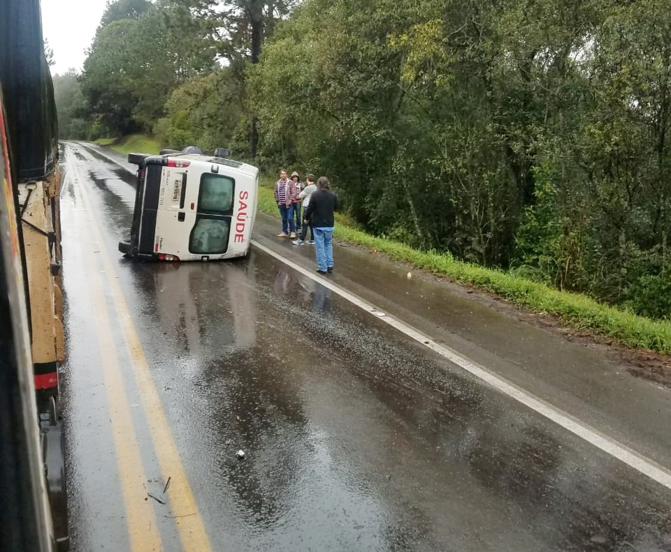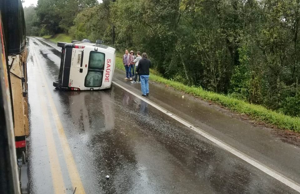 Ambulância tomba na BR-282 em Vargem Bonita e deixa feridos