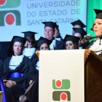 Além da entrega dos diplomas, do discurso do orador, do juramento e da mensagem do paraninfo da turma e do representante do reitor Marcus Tomasi, o ato solene foi marcado por homenagens aos pais, às tutoras Izabel Amazonas e Sinclair Biazotti e à coordenadora do polo de Joaçaba, Ana Claudia Knollseisen.
