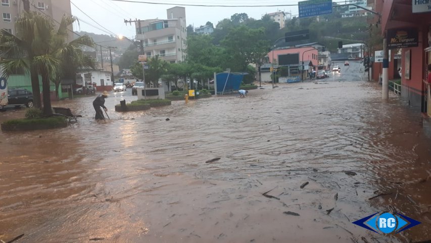 O Rio Capinzal, que corta o centro da cidade transbordou, na esquina das Ruas Presidente Nereu Ramos e Luiz Dorini.