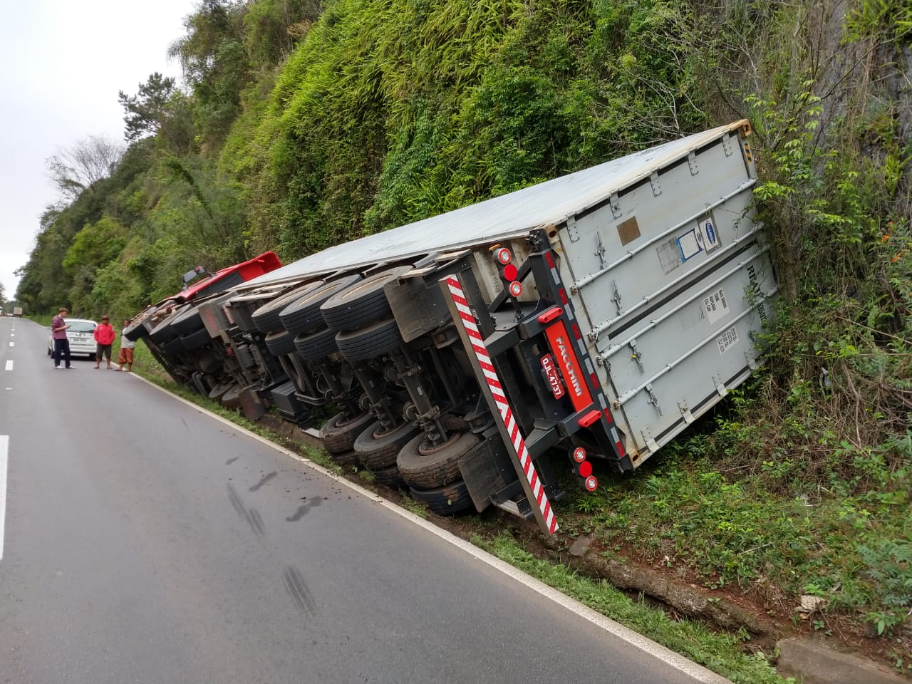 O motorista de uma carreta com placas de Itajaí (SC) levou um grande susto na manhã desta quinta-feira (04) na BR-282 em Herval d’Oeste. Ele estava subindo a serra na comunidade de Linha Pacífico quando foi surpreendido por outro caminhão que fez uma ultrapassagem e cortou a frente. Para não colidir o motorista desviou, e a carreta acabou caindo dentro de uma valeta. Ela ficou tombada. Apenas danos materiais foram registrados.