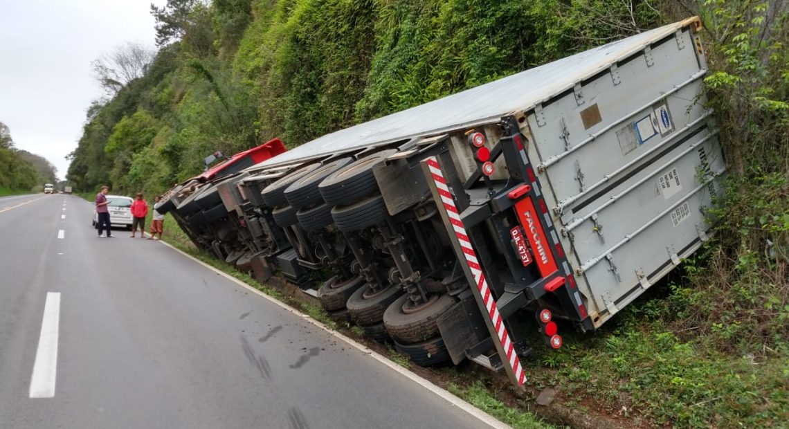 Carreta tomba na BR-282 em Herval d’Oeste
