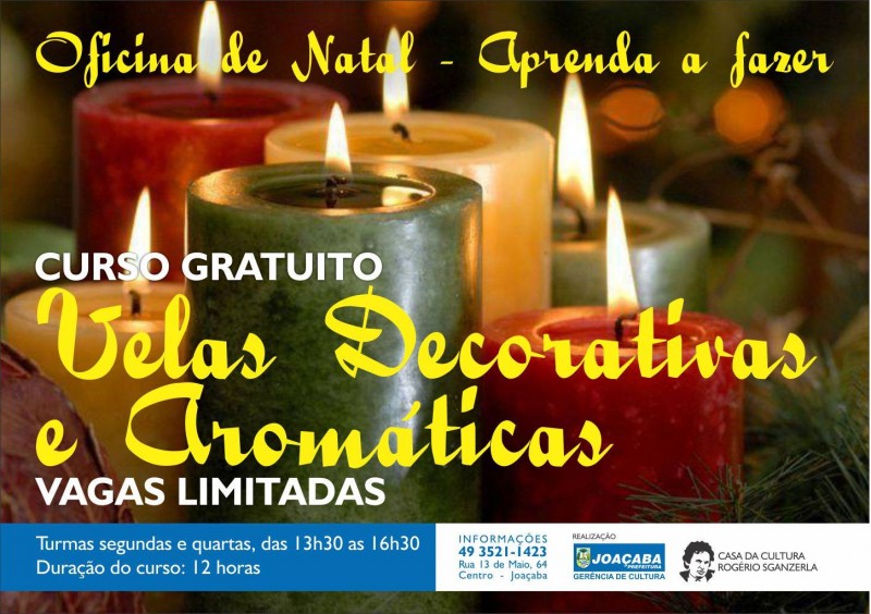 A Casa da Cultura Rogério Sganzerla está com inscrições abertas para Oficina de Natal de Velas Decorativas e Aromáticas. As inscrições são gratuitas e podem ser feitas até o dia 31 de outubro, diretamente na Casa da Cultura, de segunda a sexta-feira, das 13h às 19h.