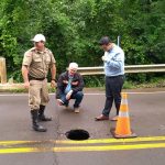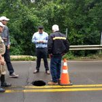 O gerente regional do Deinfra, engenheiro Luiz Felipe Gemelli, o coordenador regional da Defesa Civil, Adair Flamia e a Polícia Militar Rodoviária estiveram novamente na tarde desta quinta-feira (18) na SC-150 para avaliar as condições da cabeceira da ponte sobre o Rio Caciano, entre Lacerdópolis e Joaçaba, onde um buraco se formou na tarde de ontem.