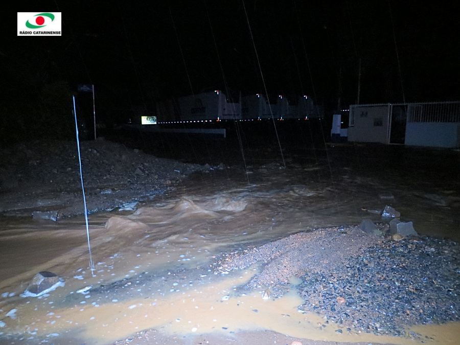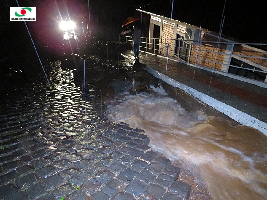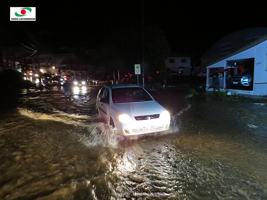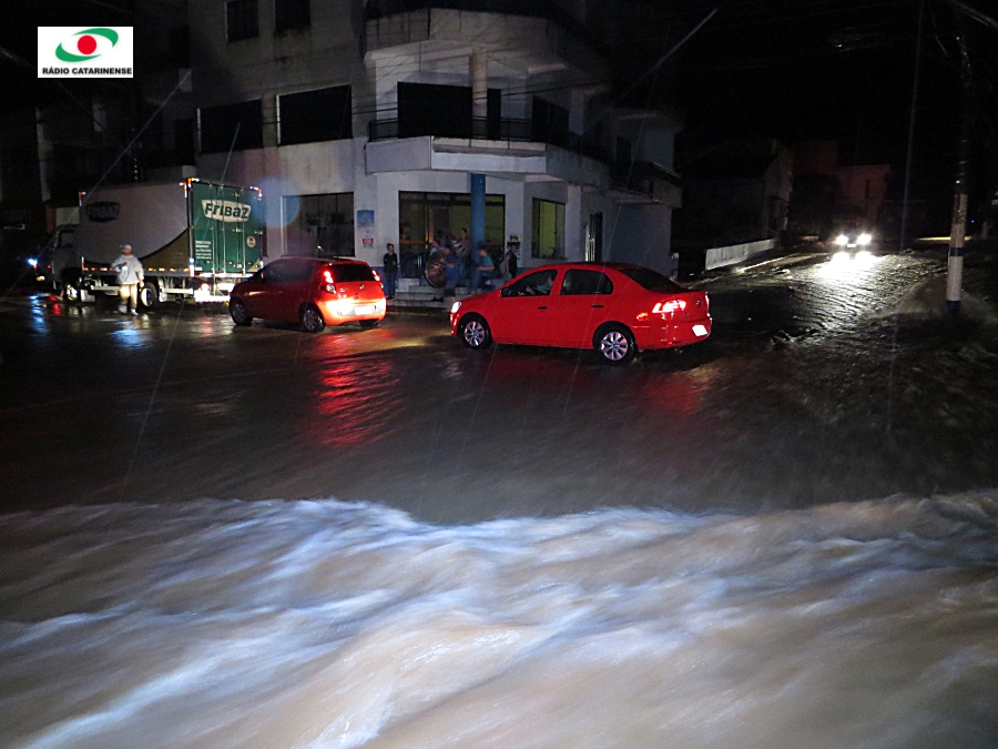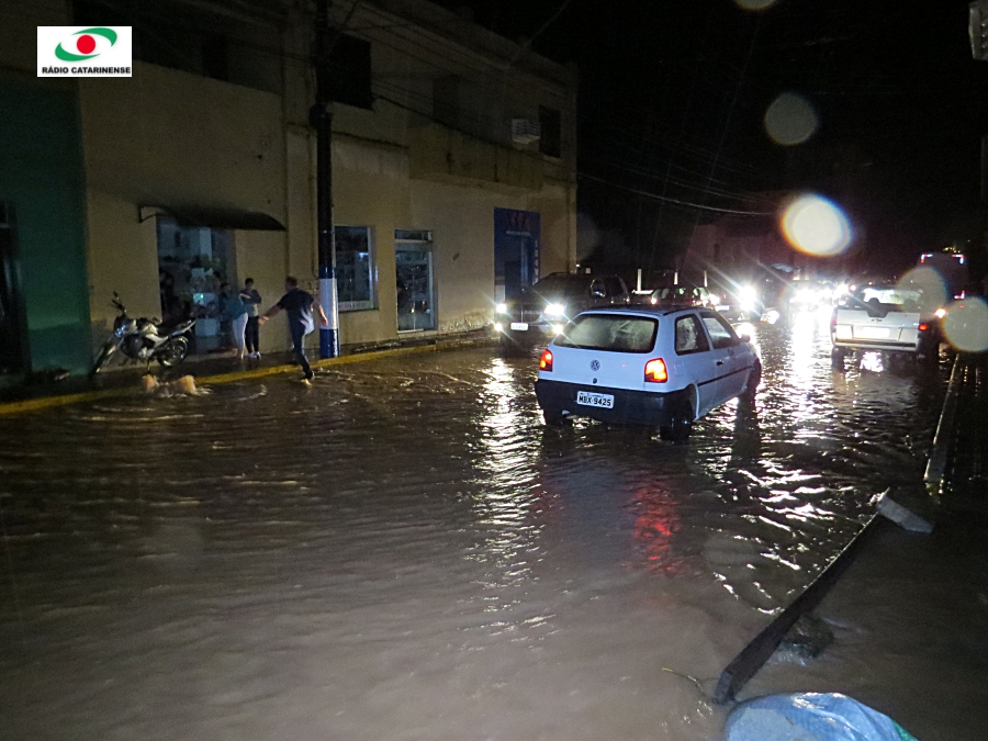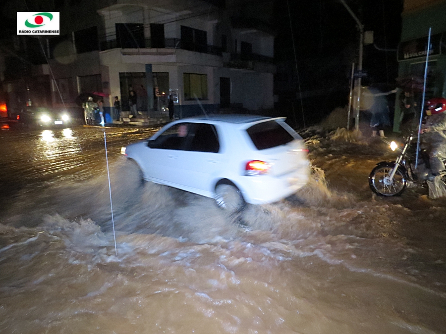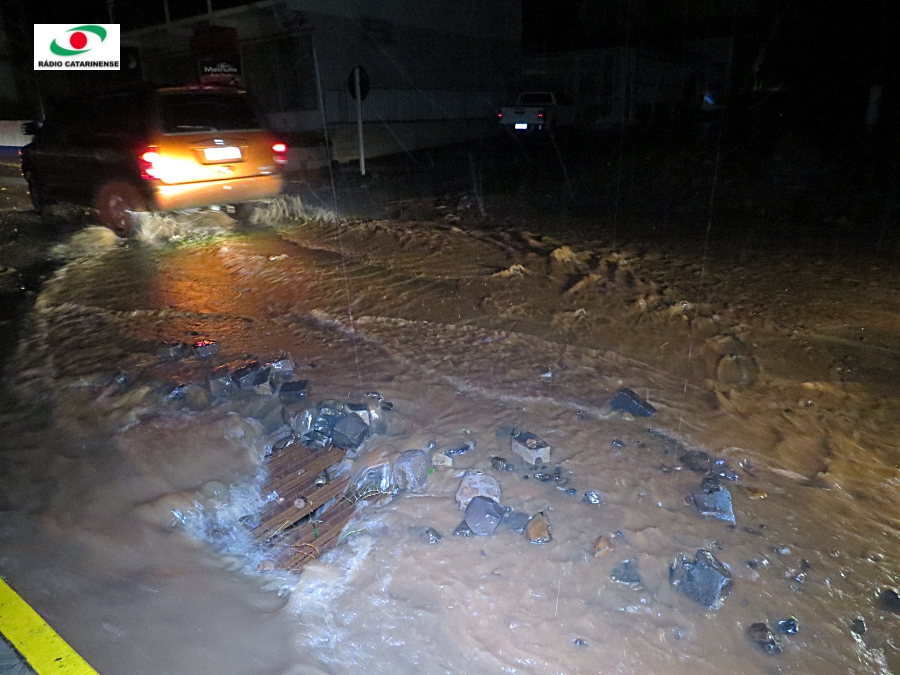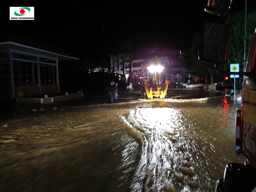A equipe de jornalismo da Rádio Catarinense se deslocou para o município por volta das 19h. No pórtico de entrada uma imensa fila de veículos em razão da SC, que corta o município, estar interditada em vários pontos. Nossa reportagem estacionou o veículo e saiu a pé pelo acostamento encontrando pelo caminho muita água, bueiro entupido e família com rodo, pá e vassouras na mão tentando limpar ou impedir que a água invadisse as casas. Na região da rodoviária, até próximo da delegacia, se formou um grande lago com a água chegando próximo de 2 metros. Parte da água que descia da região da gruta veio para a rodovia, arrastando pedras de calçamento, terra e entulhos, entupindo bueiros.