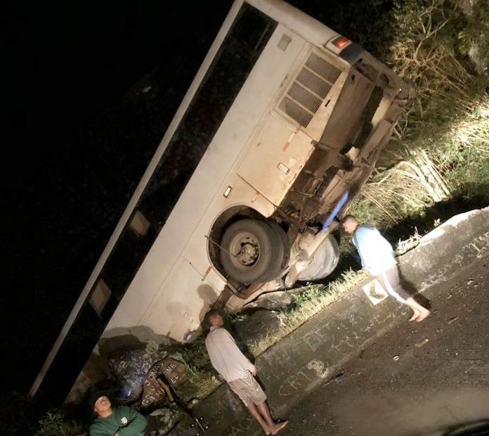 Por muito pouco não se registra uma tragédia na Serra do Rio do Rastro. Um ônibus que transportava trabalhadores ficou pendurado na mureta que separa a pista do penhasco em uma das dezenas de curvas acentuadas da Serra. O acidente ocorreu na noite desta quarta-feira, por volta das 23h15min, no Km 409 da SC 390, local onde sempre acontecem acidentes. A Polícia Rodoviária, responsável pelo trecho, informou que o coletivo é do Estado de São Paulo e descia a serra com 10 passageiros, mas ninguém ficou ferido. O motorista disse à guarnição que o veículo ficou sem freio e colidiu em outro ônibus antes de se projetar contra as muretas.