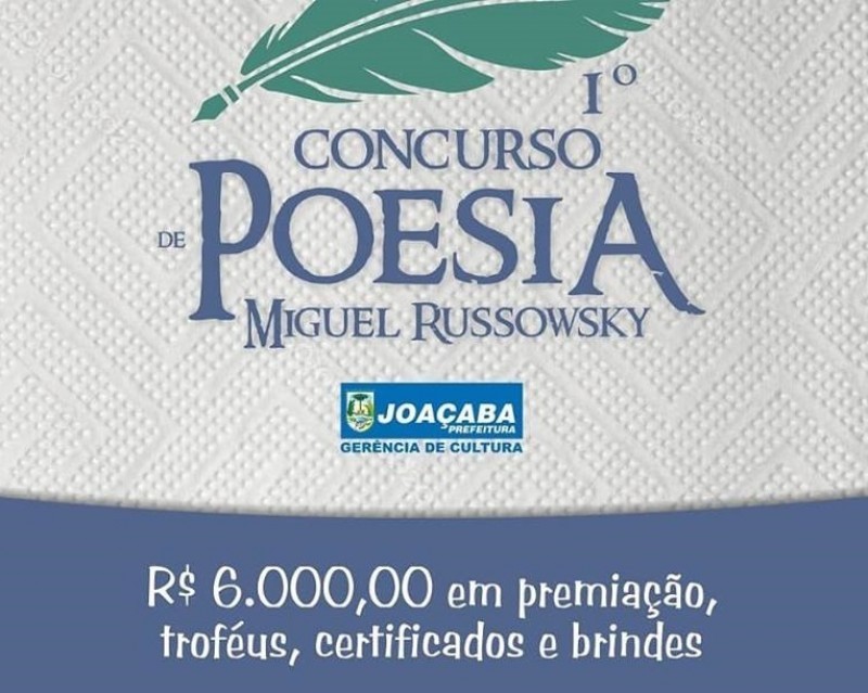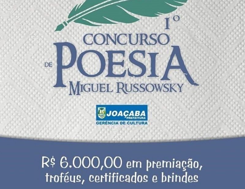 Iniciou no mês de outubro e encerra no dia 30 de novembro o prazo para realizar as inscrições do 1º Concurso de Poesia Miguel Russowsky. A competição, promovida pela Casa da Cultura Rogério Sganzerla, visa resgatar e valorizar os talentos literários do município de Joaçaba, bem como homenagear o poeta Miguel Russowsky, natural de Santa Maria (RS), grande empreendedor, médico, enxadrista e sonetista, que por 60 anos fez de Joaçaba sua terra do coração.