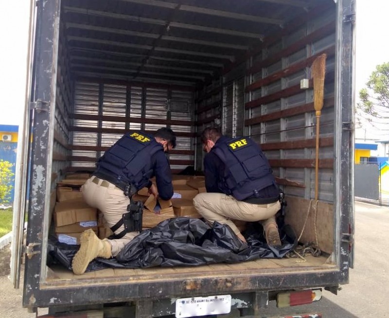 A Polícia Rodoviária Federal apreendeu na tarde desta segunda-feira (12) um caminhão Mercedes Benz/710 carregado com camarão contrabandeados da Argentina. O veículo, com placas de Santo Amaro da Imperatriz, foi abordado por volta das 14h em um posto de combustíveis às margens da BR-282, em Lages.