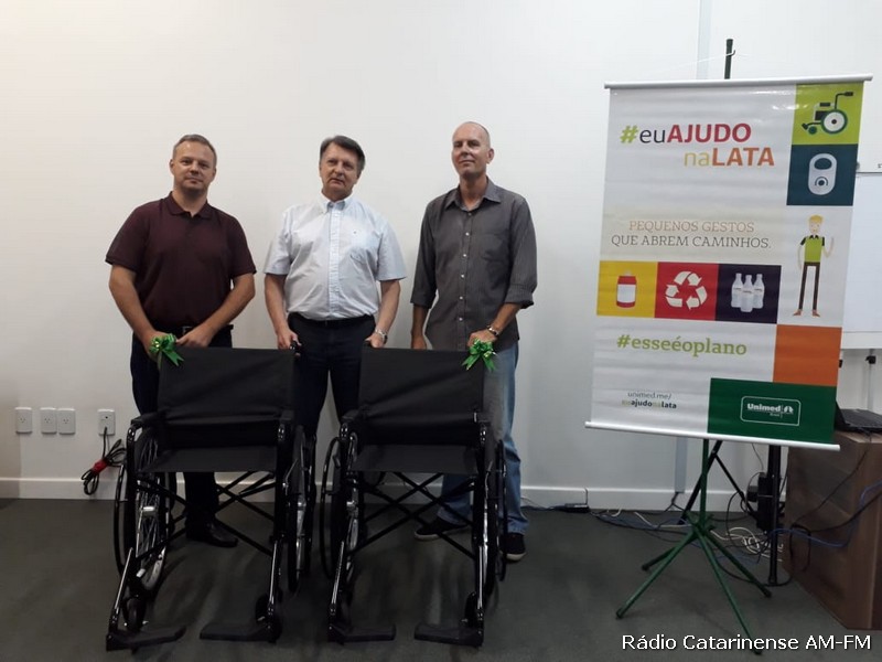 Na tarde desta quinta-feira (29), diretores da Unimed de Joaçaba fizeram a entrega de duas cadeiras de rodas que foram conseguidas através do projeto denominado “Eu Ajudo na Lata”, que arrecada lacres de alumínio das latas de refrigerantes e cervejas.