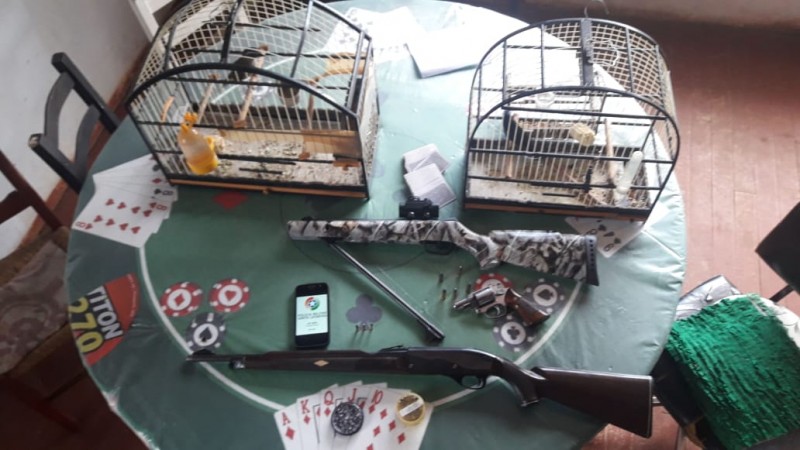 Diante dos fatos os policiais deram voz de prisão e continuaram as buscas no local, onde encontraram e apreenderam dois pássaros  silvestres, um rifle calibre .22, uma espingarda de pressão e munições.
