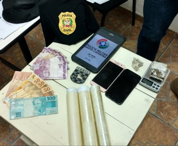 Com V.R.F foram apreendidos R$ 330,00 duas porções de maconhada prontas para a venda, além de objetos utilizados tipicamente na comercialização da droga. Conforme a polícia o suspeito é reincidente. Ele recebeu voz de prisão e foi encaminhado à delegacia de polícia de Joaçaba. Um cão farejador do 26º Batalhão de Polícia Militar de Herval d’ Oeste auxiliou nos trabalhos.