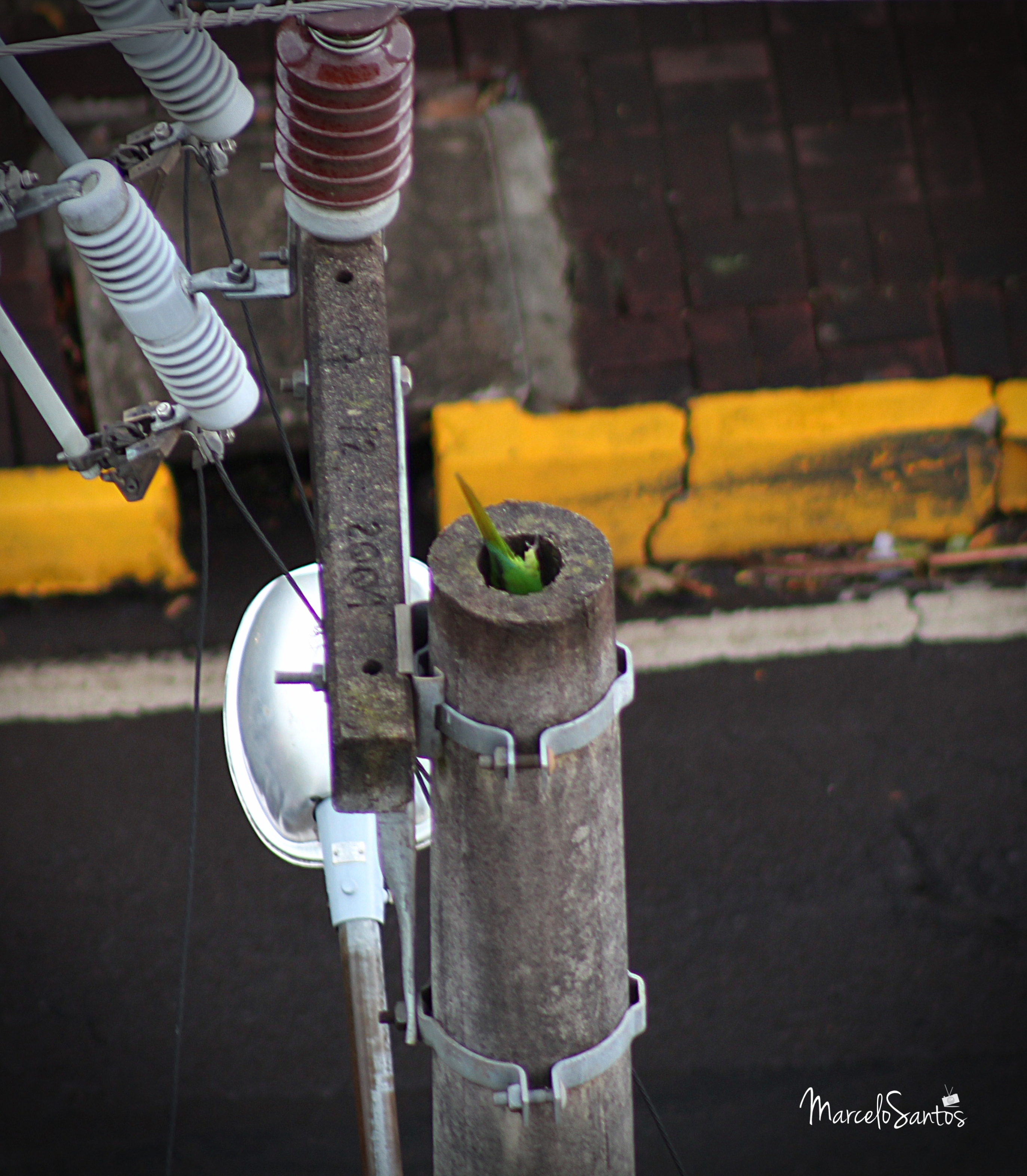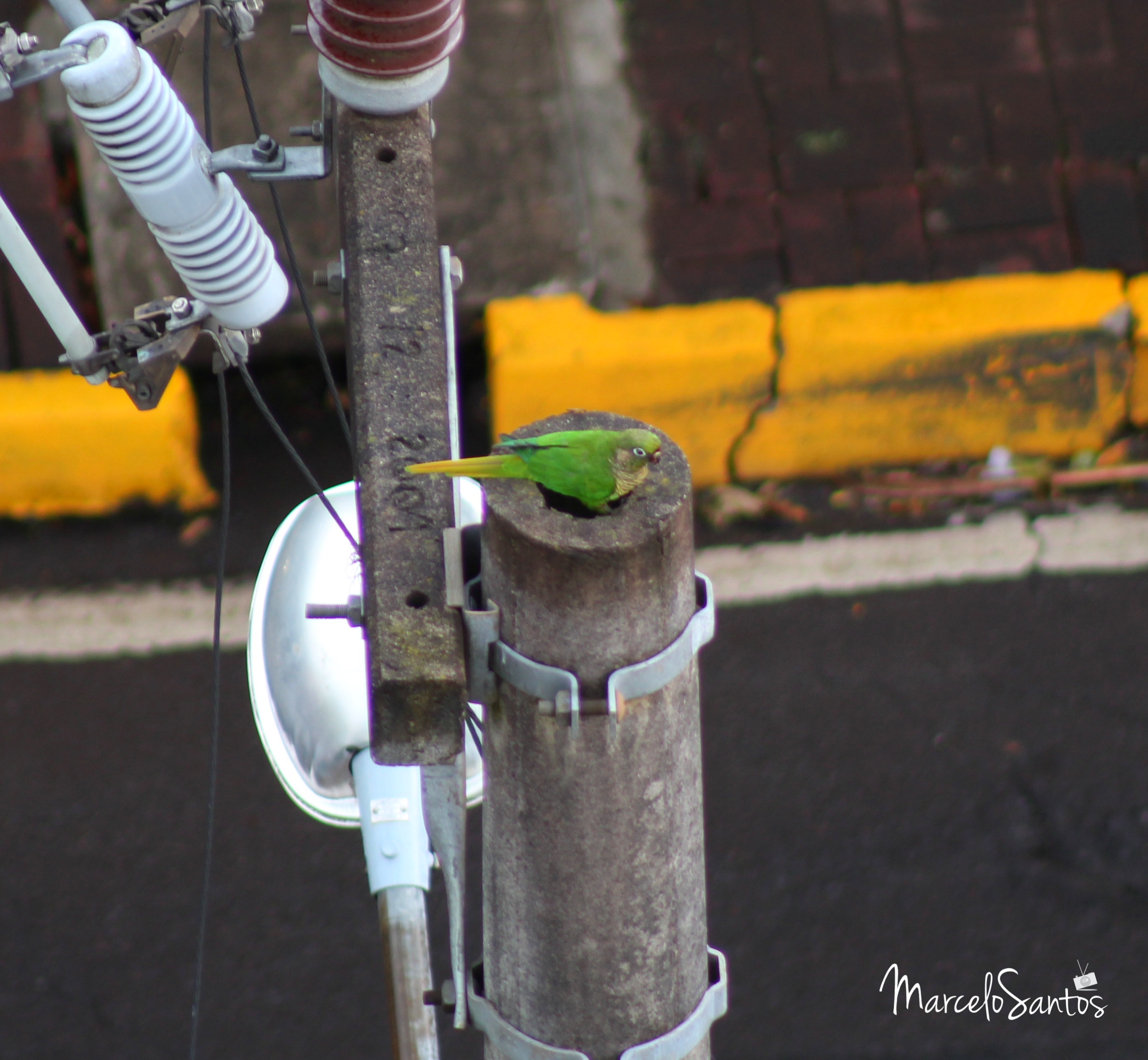 Um casal, a princípio de caturritas do mato, encontrou abrigo e escolheu um poste de concreto da rede de distribuição de energia para fazer seu ninho. As aves se revezavam e entravam no poste pela cavidade do topo, repetindo este procedimento várias vezes enquanto eram observadas. Não se mostravam incomodadas com o fluxo contínuo e barulhento de veículos.