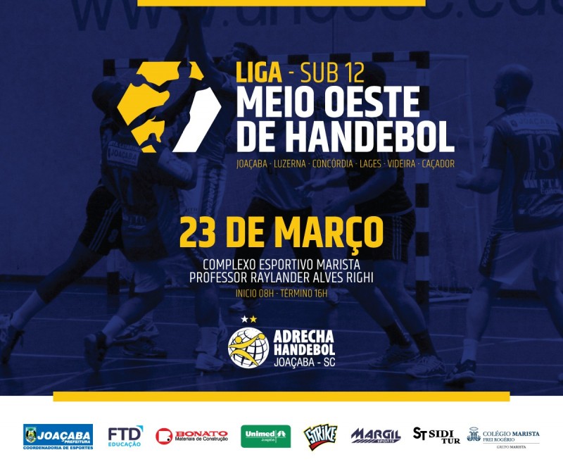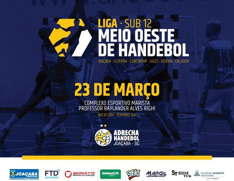 No próximo sábado, dia 23 de março, Joaçaba sediará a Liga Meio Oeste de Handebol, categoria sub-12. Aproximadamente 250 meninos e meninas participarão do evento, que será realizado no Complexo Esportivo Marista Professor Raylander Alves Righi, a partir das 08h. Estão confirmadas equipes das cidades de Joaçaba, Luzerna, Concórdia, Lages, Caçador e Videira.