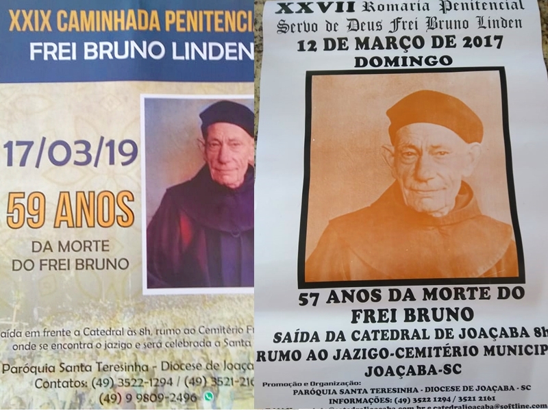 Romaria ou Caminhada Penitencial à Frei Bruno? O cartaz promocional deste grande evento religioso da Igreja Católica, que reúne multidões em Joaçaba todos os anos, gerou surpresa e desagrado para alguns devotos do religioso ligados principalmente a extinta Associação dos Amigos de Frei Bruno. Depois de quase três décadas usando o termo “Romaria”, desde o ano passado a comissão organizadora mudou a nomenclatura para “Caminhada Penitencial”.