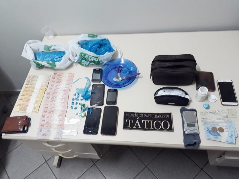 Com as provas do tráfico, os policiais se deslocaram até a residência onde encontraram um casal e sobre uma mesa, algumas buchas de cocaína prontas para o comércio, um plástico com uma pedra maior da substância, embalagens plásticas para embalar a droga, além de R$ 395,00 e alguns aparelhos celulares que serão investigados.