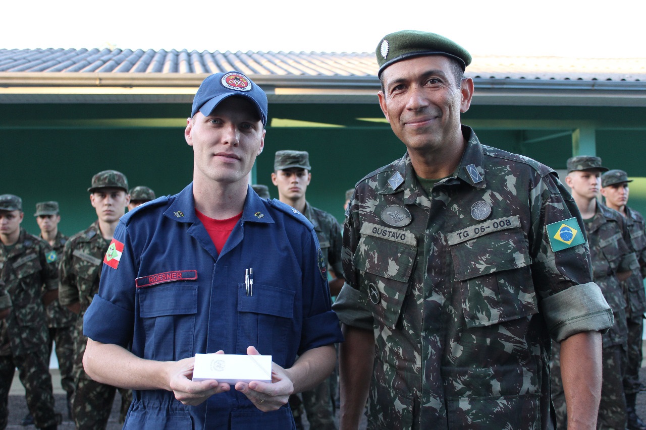 Ao final, os atiradores desfilaram em continência ao Chefe da Instrução do Tiro de Guerra e em homenagem ao Exército Brasileiro e aos agraciados ao som do dobrado Batista de Mello.
