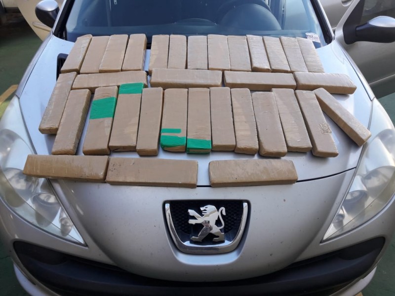 No carro estavam três pessoas, sendo um homem e duas mulheres. Na abordagem pessoal, nada foi encontrado com as pessoas, sendo que no interior do Peugeot os policiais encontraram 33 tabletes de maconha que totalizaram mais de 20 quilos.