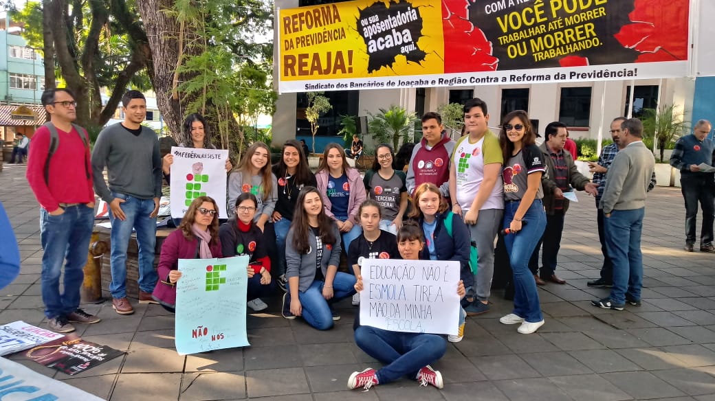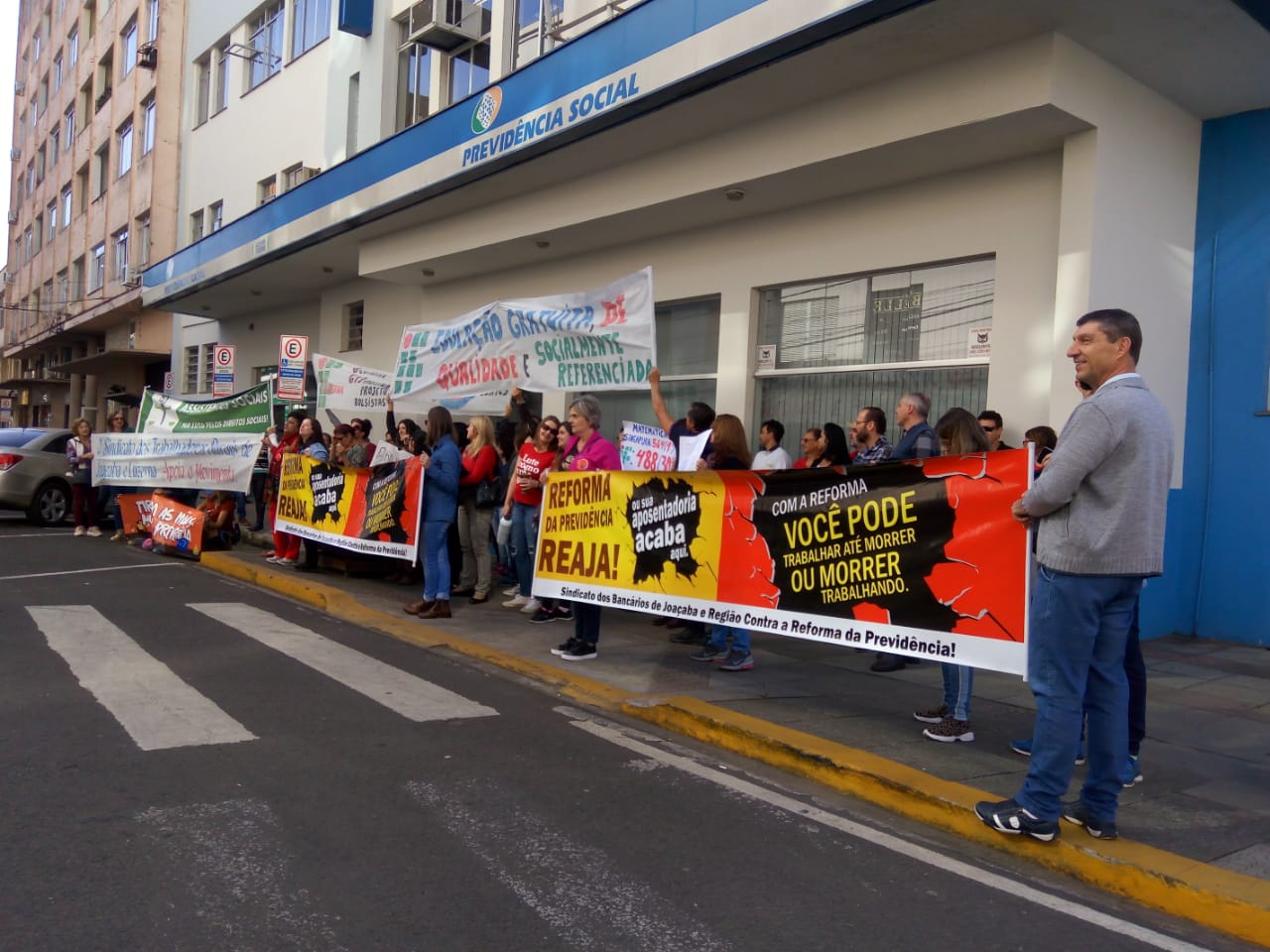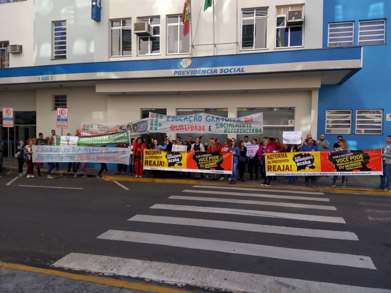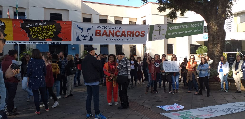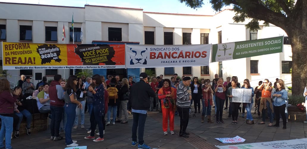 Em Joaçaba os manifestantes estão reunidos com faixas e cartazes na praça Adolfo Konder e também em frente a agência da Previdência Social na XV de Novembro. O ato é organizado pelo Coletivo Sindical que envolve vários sindicatos. Os manifestantes estão aproveitando o momento para esclarecer a população sobre alguns pontos polêmicos da Reforma.