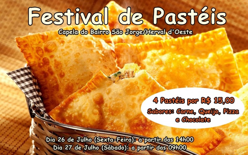 A comunidade do bairro São Jorge espera você para uma deliciosa pastelada que acontecerá nesta sexta-feira (26) e sábado (27) no Centro Social, localizado em anexo a Capela São Jorge, em Herval d´Oeste. Os pastéis estão sendo comercializados de duas formas: individual ou em um combo com quatro pastéis pelo valor de R$ 15,00. Os sabores disponíveis são: carne, queijo, pizza e chocolate preto. Os interessados em adquirir o combo podem fazer seus pedidos pelo WhatsApp (49) 9.8854-5761. Neste mesmo contato, pode-se alinhar a entrega dos deliciosos pastéis.