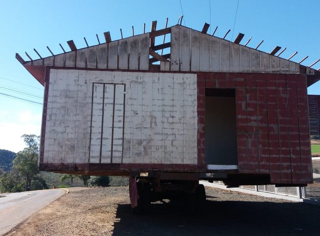 Uma casa de madeira foi flagrada sendo transportada por uma máquina agrícola com reboque, na SC-283 em Caibi (SC) , na quinta-feira (18) . O motorista não possuía autorização para realizar o transporte e a casa ocupava as duas faixas da rodovia.