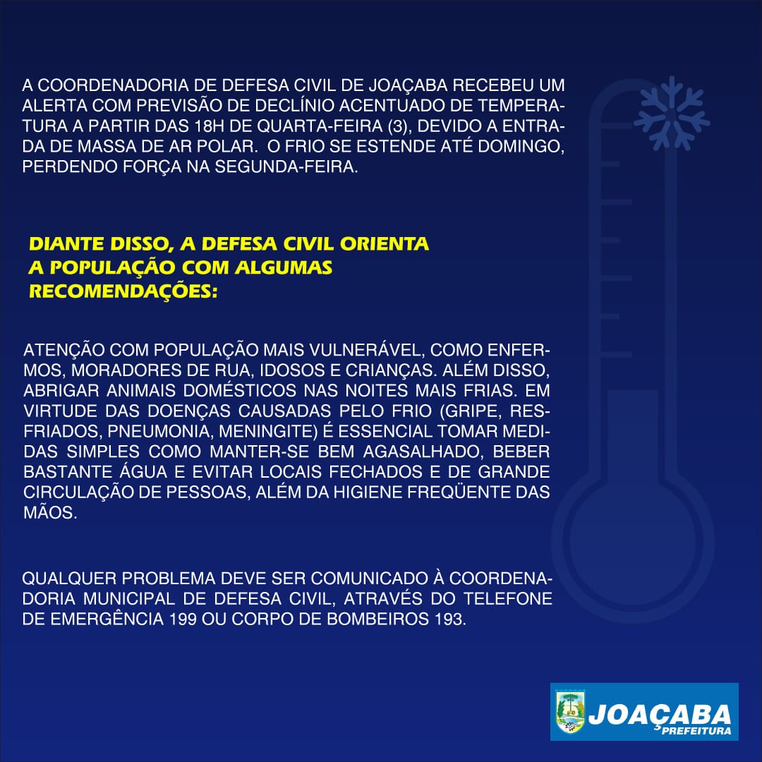 A Coordenadora de Defesa Civil de Joaçaba emitiu uma alerta em razão da previsão acentuada de declínio de temperatura a partir da noite desta quarta-feira (03) no Meio-Oeste em razão da chegada de uma massa de ar polar. De acordo com o comunicado o frio vai ser intenso até o próximo domingo. A maior preocupação da Defesa Civil é com a população mais vulnerável, moradores de rua, idosos e crianças. Outra recomendação é para abrigar os animais domésticos. Qualquer problema deve ser comunicado a Defesa Civil pelo 199.