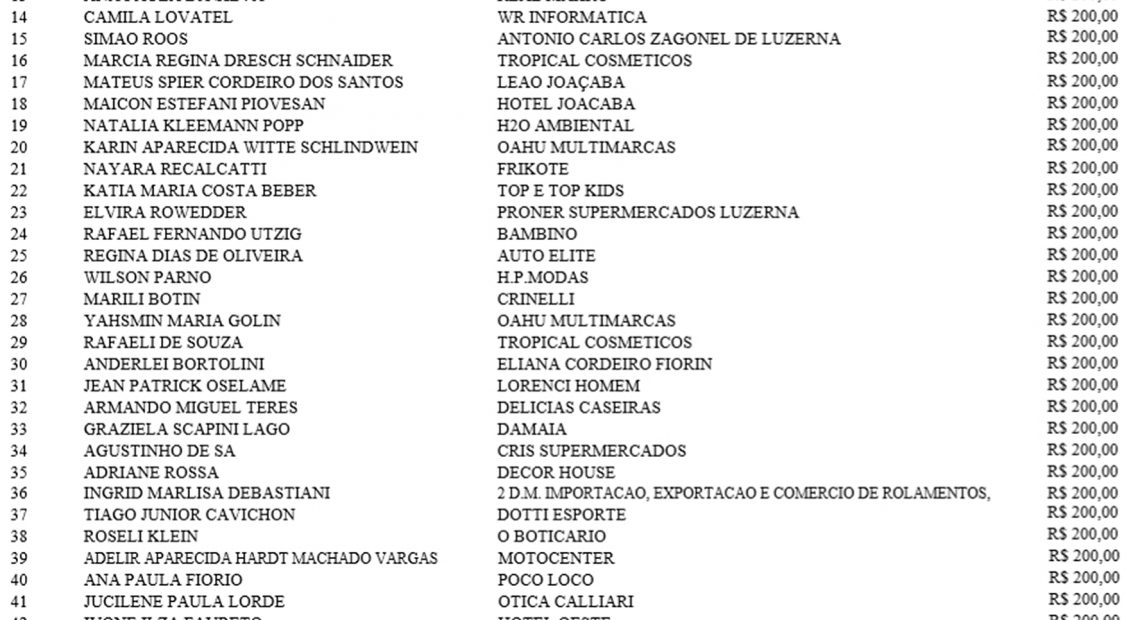 A Câmara de Dirigentes Lojistas de Joaçaba (CDL) e o Núcleo de Dirigentes Lojistas de Luzerna divulgaram na manhã desta quinta-feira (15) a relação dos 54 consumidores que foram sorteados na promoção do Dia dos Pais. Eles compraram nos lojas e prestadores de serviços associados à CDL e NDL e estavam concorrendo a R$ 20 mil em vale-compras com valores de R$ 200,00 a R$ 5 mil. O maior prêmio (R$ 5 mil) saiu para a consumidora Indiamara Priscila Dal Magro que recebeu o número da sorte da Loja Leão em Joaçaba. A entrega da premiação vai acontecer já nesta sexta-feira em dois momentos: Às 11h e as 17h na sede da CDL no Edifício Erme Center. Os ganhadores estão sendo contatados pelo telefone.