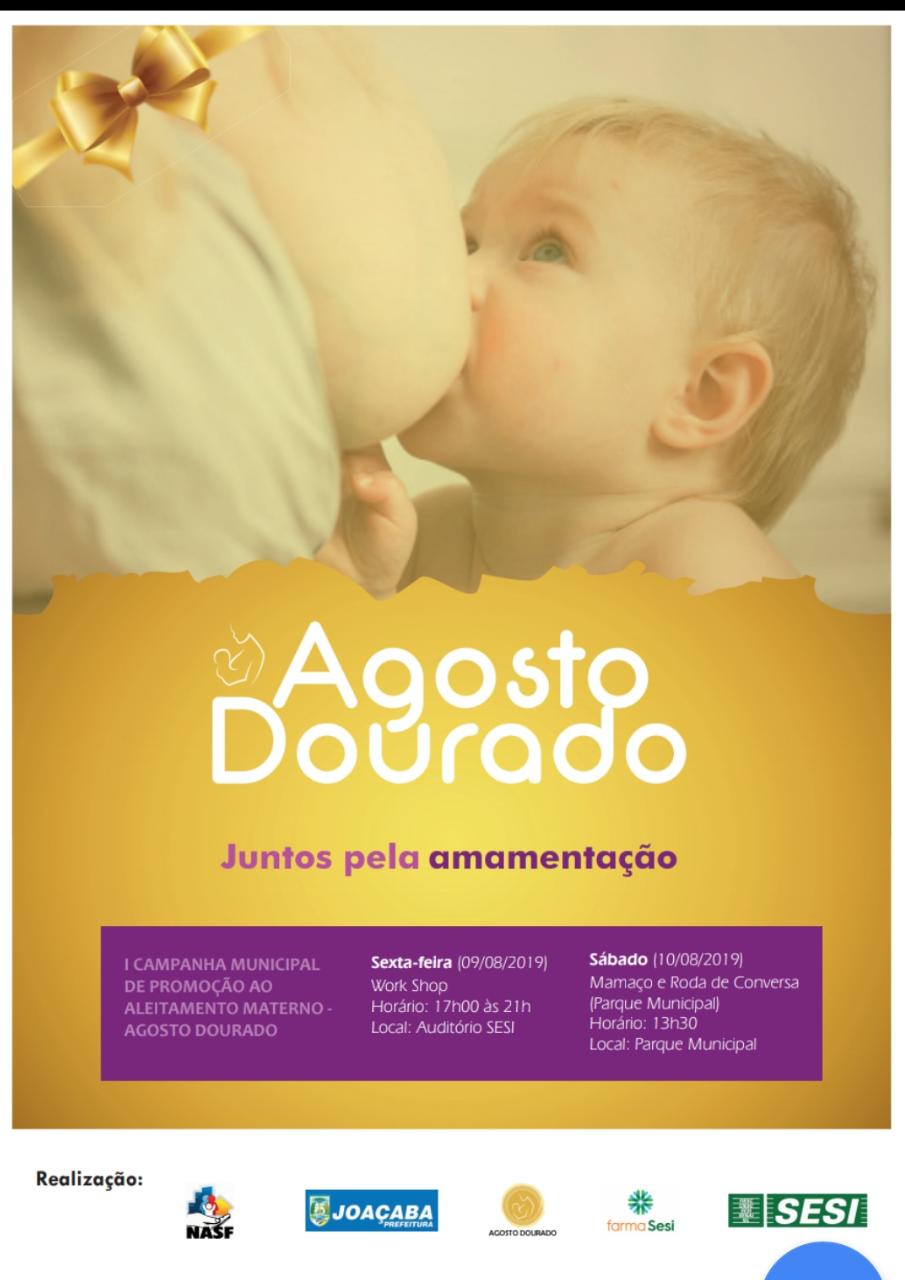 O mês de agosto é conhecido como Agosto Dourado, porque simboliza a luta pelo incentivo à amamentação e é o mês dedicado à intensificação das ações de promoção, proteção e apoio ao aleitamento materno. Diante disso, a Secretaria de Saúde de Joaçaba estará promovendo a I Campanha Municipal de Promoção ao Aleitamento Materno, que envolve uma série de ações relacionadas ao tema.