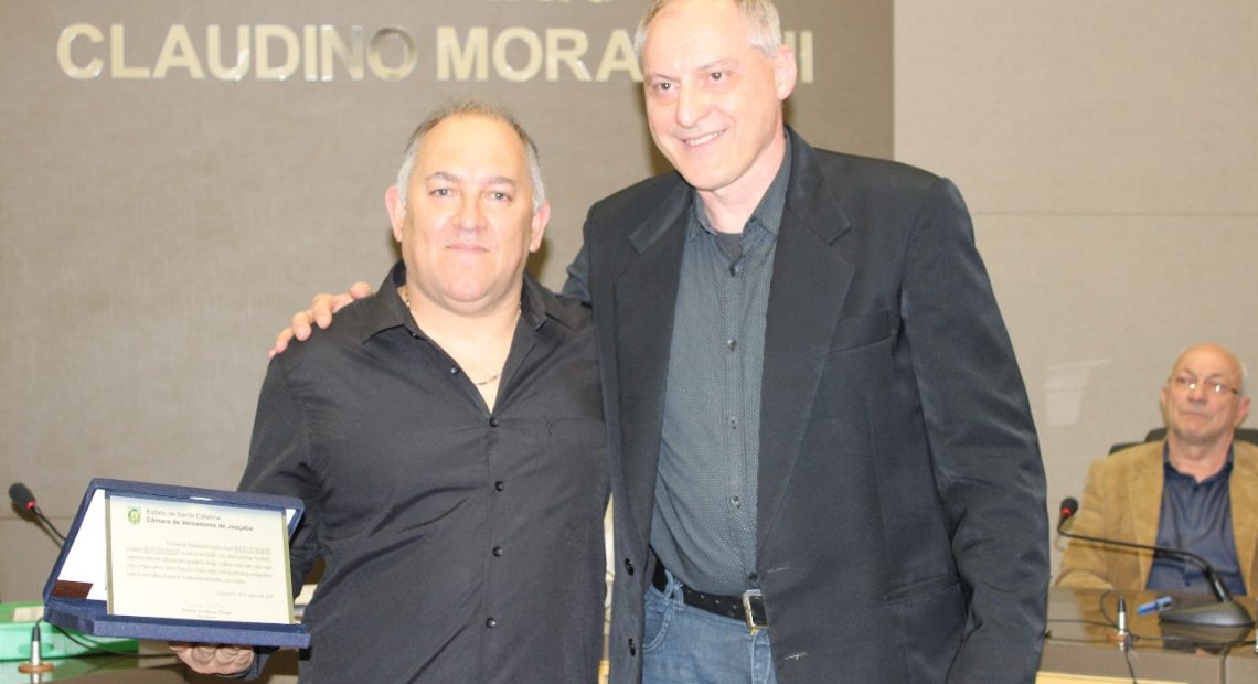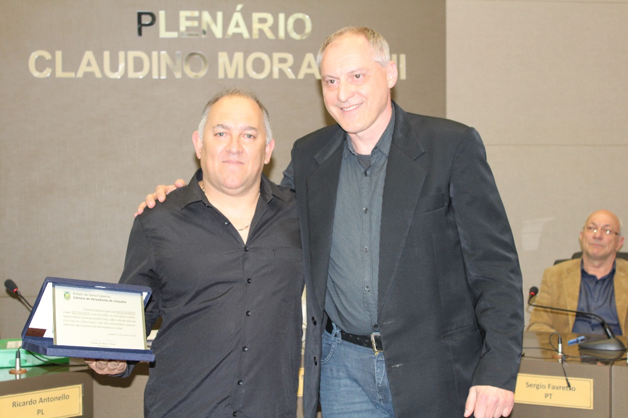 image001 Por proposição do vereador André Dalsenter, o músico recebeu, em sessão desta terça-feira (6) uma Moção de Aplauso. A homenagem, segundo o vereador André, se deu pela composição da letra e da música ‘De Dois em Dois, Joaçaba Cantada em Versos’. Composta em meados de 2017, a música faz uma referência a fatos, pessoas e obras históricas de Joaçaba e seus 100 anos. Somente no início de 2018 é que ela foi lançada ao público através das redes sociais. “Esta modesta homenagem é uma maneira de enaltecer o talento deste músico e também agradecer ao Silvio por esta música que faz com que o nome de Joaçaba se torne ainda mais conhecido”, disse o proponente André.