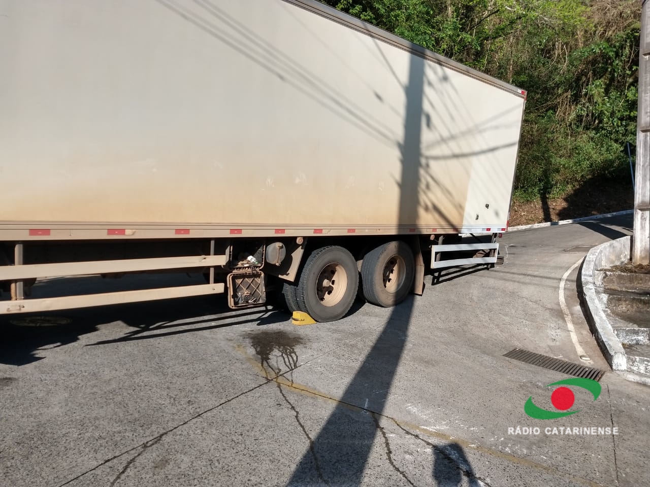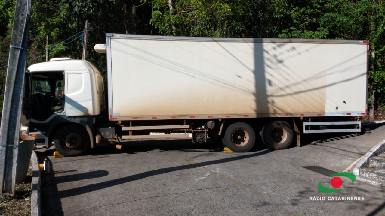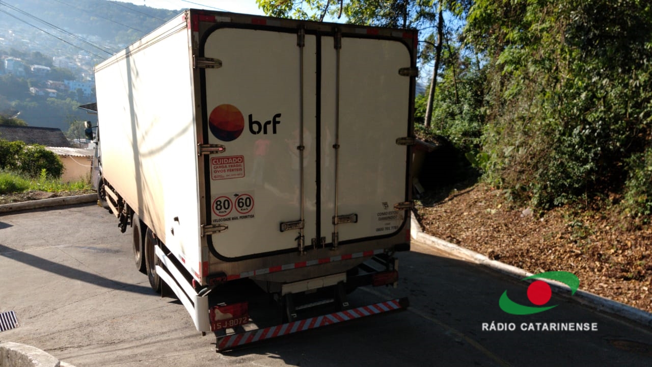 Caminhão fica “entalado” na rua Augusto Arbugéri em Joaçaba