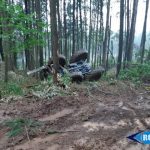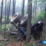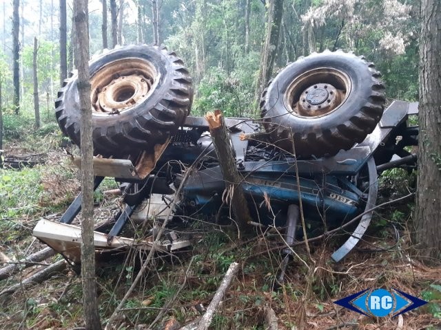 De acordo com informações levantadas no local, o trator estava sendo retirado do caminhão prancha pelo operador, quando deslizou e tombou em meio as árvores.