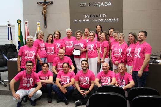Era final de 2017 quando a joaçabense Aurelinda Surdi, 54 anos, descobriu um câncer no ovário. Após uma cirurgia e sessões de quimioterapia ela foi incentivada pela filha a buscar apoio junto a Rede Feminina de Combate ao Câncer (RFCC), local que vem frequentando há quase dois anos. Na Rede, Aurelinda fez amizades, pratica Yoga e Reiki e recebe apoio psicológico. Ela terá que passar por mais uma cirurgia em breve e relata que a filha, a família, amigos e a Rede fazem toda a diferença para que encontre forças para continuar o tratamento. É um trabalho maravilhoso o que fazem aqui”, diz ela. Como forma de reconhecer o trabalho voluntário e a dedicação das mulheres que constroem a Rede Feminina de Combate ao Câncer de Joaçaba, a Câmara de Vereadores entregou uma Moção de Aplauso às integrantes da entidade na sessão de segunda-feira, 7 de outubro. A proposição da homenagem foi do vereador Luiz Vastres e aprovada por todos os demais vereadores.
