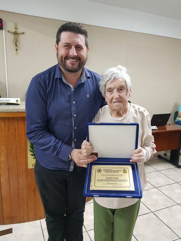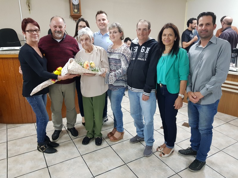 A Câmara de Vereadores homenageou na sessão desta segunda-feira (21) a hervalense Amália Giusti, que no último domingo (20) completou 100 anos de vida. A centenária recebeu da Casa Legislativa uma Moção de Aplauso, proposta pelo vereador Everton Parisenti e aprovada por unanimidade. Grande parte da família prestigiou a homenagem.