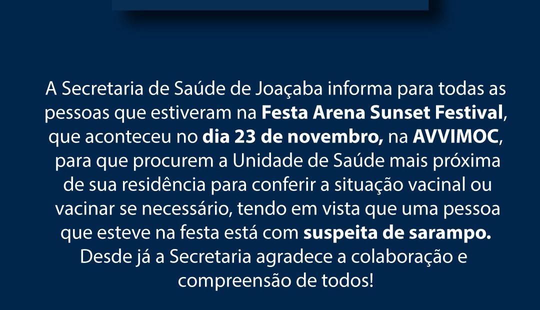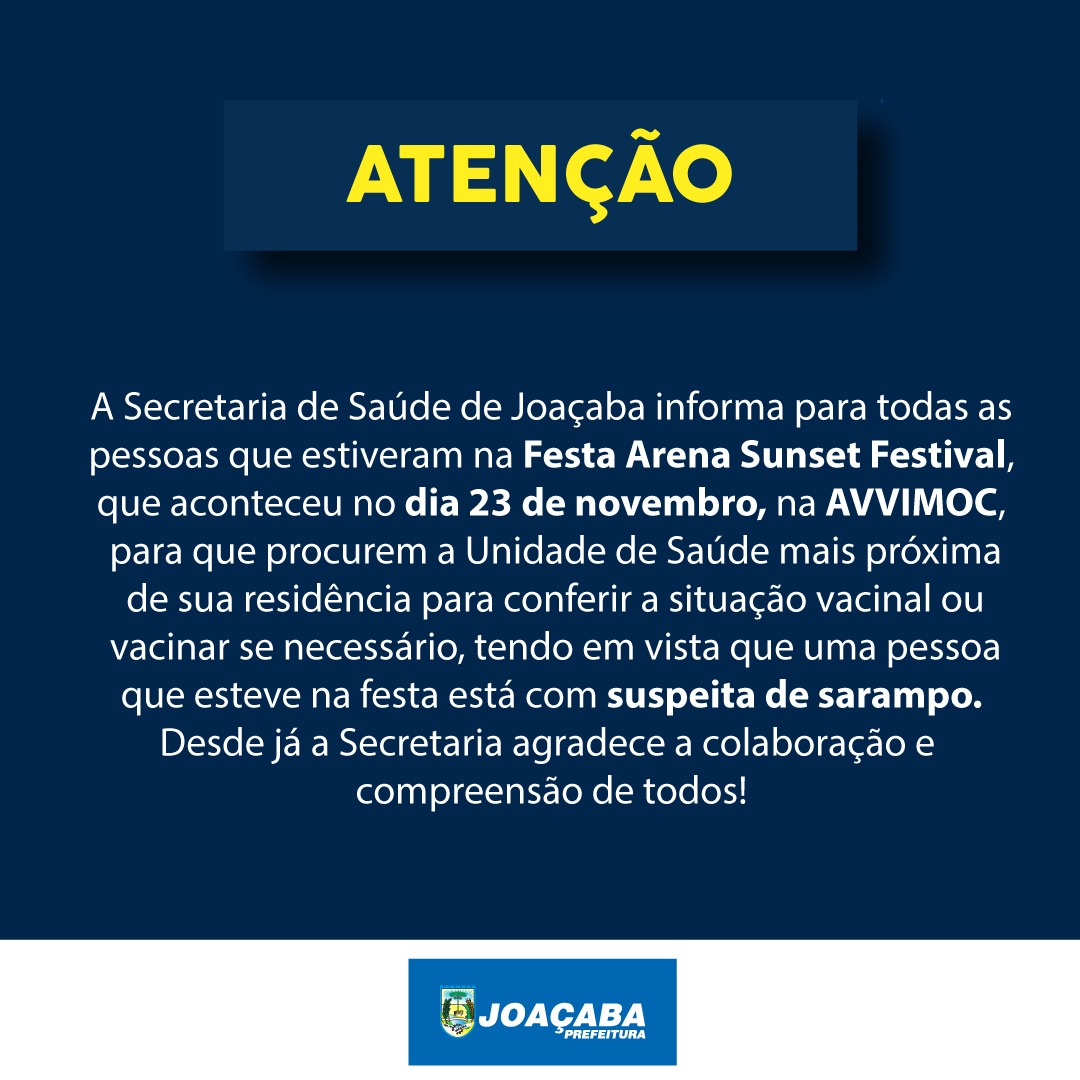 A Secretaria de Saúde de Joaçaba emitiu uma nota na tarde desta segunda-feira (02) alertandotodas as pessoas que estiveram na Festa Arena Sunset Festival, que aconteceu no dia 23 de novembro, na AVVIMOC, para que procurem a Unidade de Saúde mais próxima de sua residência para conferir a situação vacinal ou vacinar se necessário. De acordo com a nota uma pessoa que esteve na festa está com suspeita de sarampo.