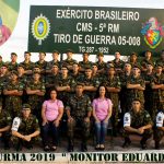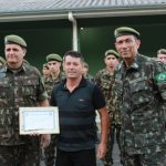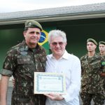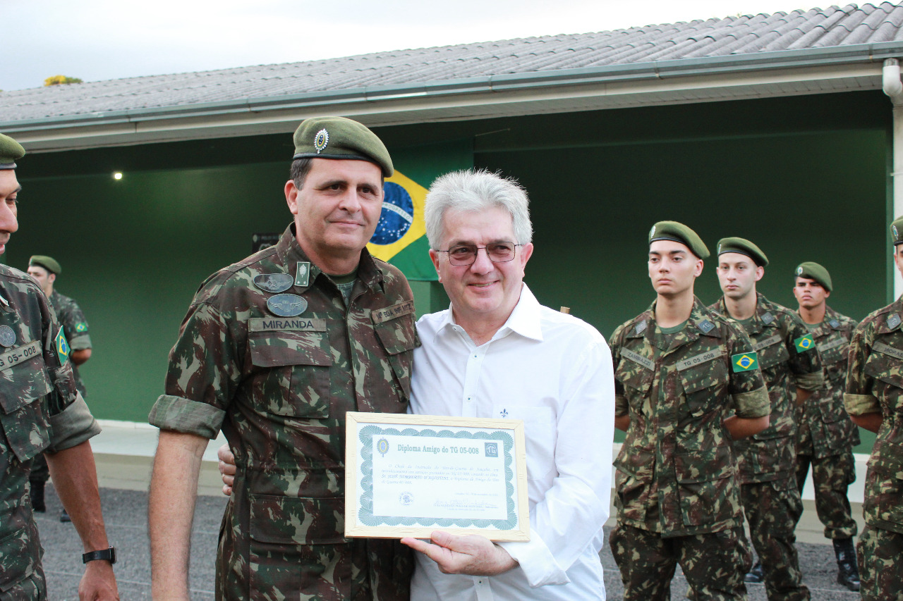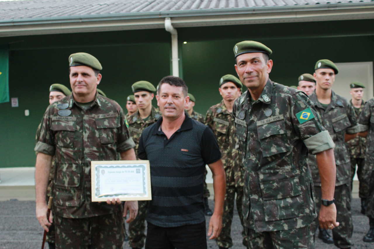 Foram entregues ainda, Diploma “Destaque da Turma”, como referência aos atiradores Falta Zero e diploma “Ao Mérito” aos vinte e nove monitores e atiradores que mantiveram excelente desempenho e modelar comportamento no prestamento do serviço militar inicial, promoção à Cabo da Reserva de 2ª Categoria dos concludentes do Curso de Formação de Cabos, que além da divisa receberam uma lembrança muito criativa ofertada pelo Sr Pedro Belotto, amigo do TG.   Por fim, foi prestada homenagem com entrega de uma lembrança a pessoas e instituições que contribuíram para a formação das Turmas 2018 e 2019, enquanto o Subtenente Gustavo, esteve à frente do TG 05-008.