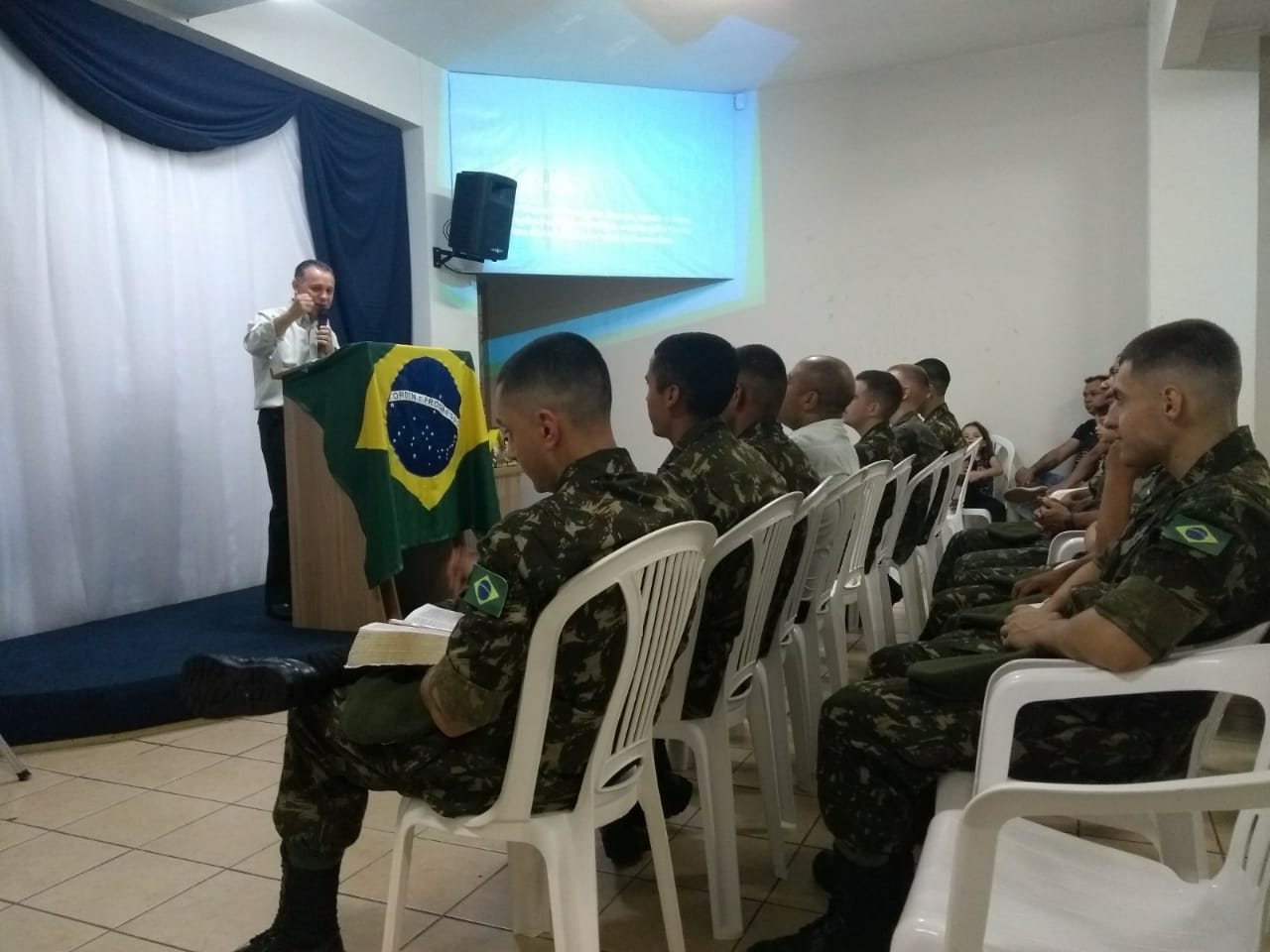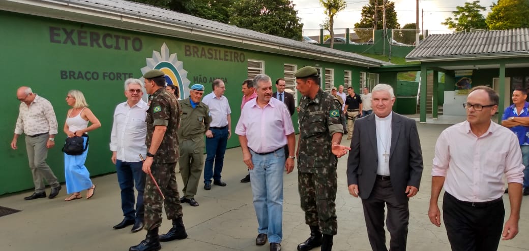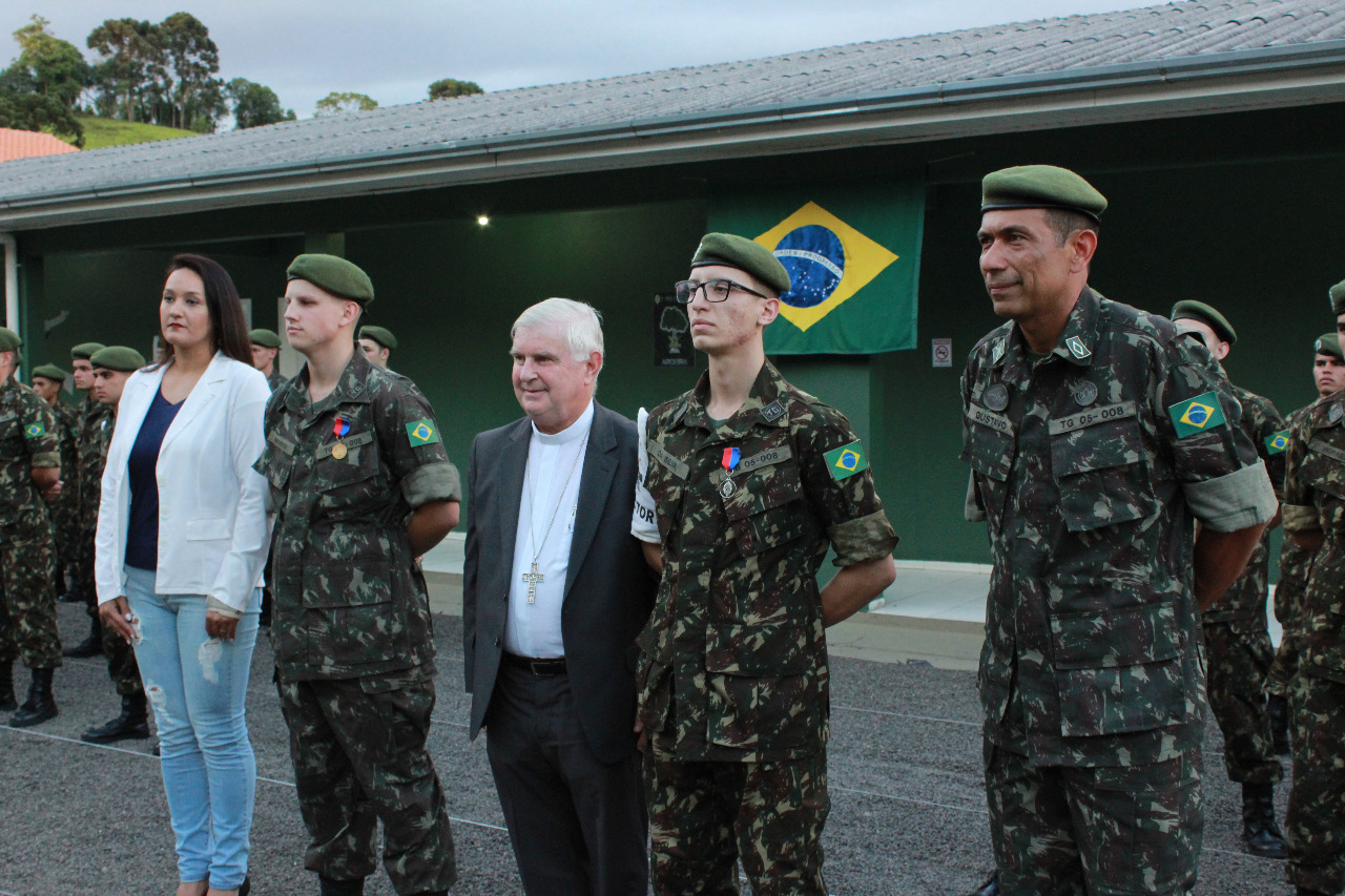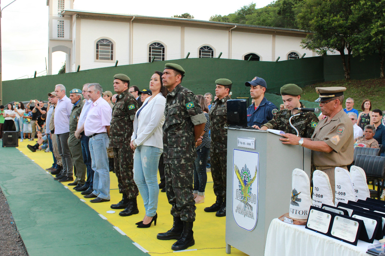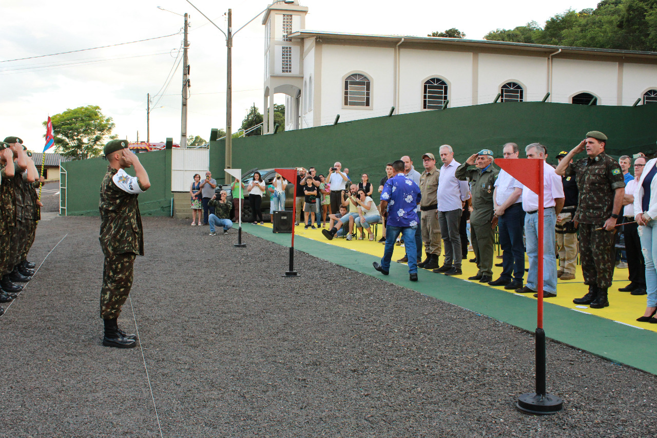 O Tiro de Guerra de Joaçaba realizou na última sexta-feira (29), a solenidade de licenciamento dos atiradores matriculados em 2019. O evento foi presidido pelo Exmo. Senhor General de Brigada, Ricardo Miranda Aversa, Comandante da 14ª Brigada de Infantaria Motorizada, com sede em Florianópolis.    O General Miranda, acompanhado do Adjunto de Comando, Subtenente Marcos Vinicius Jauhar Nogueira, prestigiaram a solenidade e juntamente com o Chefe da Instrução, Subtenente Luiz Gustavo Pires de Oliveira recepcionaram o Vice-prefeito de Joaçaba Jucelino Ferraz, o Prefeito em exercício de Herval D’ Oeste, Mauro Martins, a Presidente da Câmara de Vereadores, Disnéia De Marco, o Bispo Diocesano de Joaçaba, Dom Frei Mário Marques, o Secretário Municipal de Gestão Administrativa e Financeira, Jorge Luiz Dresch, o Chefe de Gabinete, Delcir Dotti, o Vereador Sergio Favretto, a Coordenadora Municipal de Proteção e Defesa Civil, Luci Terezinha Heberle, representantes de Órgãos de Segurança Pública, o Senhor Osni Moreira, ex-integrante do Batalhão Suez, representantes de instituições e entidades locais, familiares dos atiradores e amigos do TG.